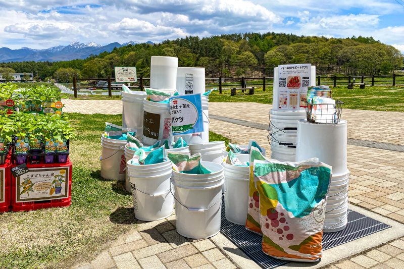 ここカゴメファームで面白いものを見つけました。バケツによるトマト栽培キットの販売。いえ、トマトのバケツやプランター栽培そのものはなんら珍しいものではありませんが、ここで取り扱われている苗の品種が大変珍しいものでした。