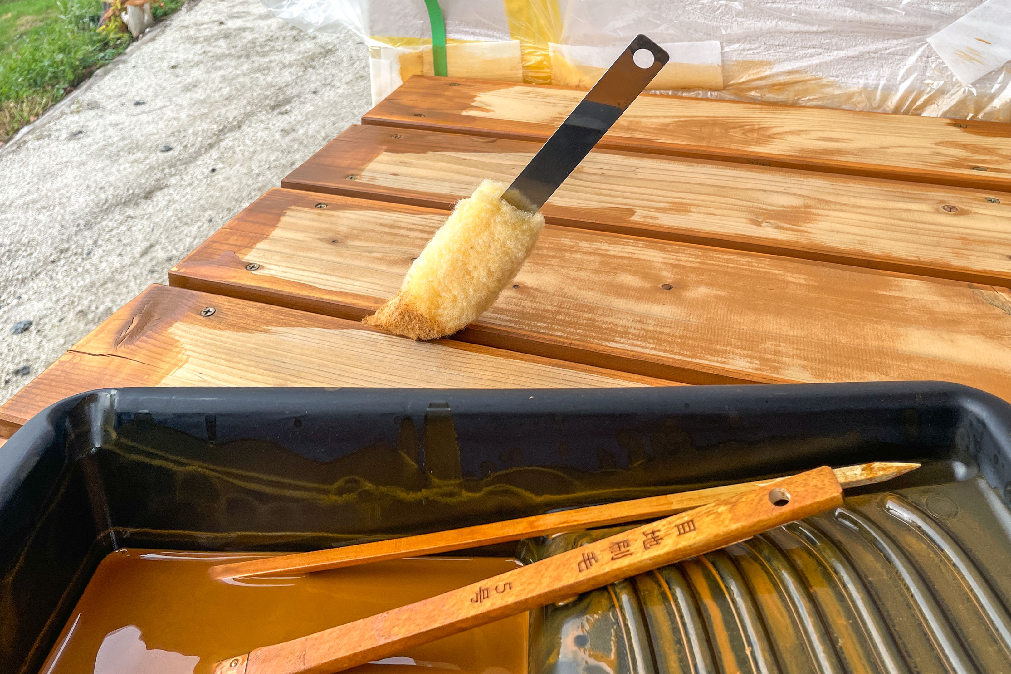 外壁との境界や柱のように直接床板と接している箇所のエッジ処理だけ慎重に行えば、デッキの塗装自体は単調でひたすらムラにならないよう塗り広げていくだけです。