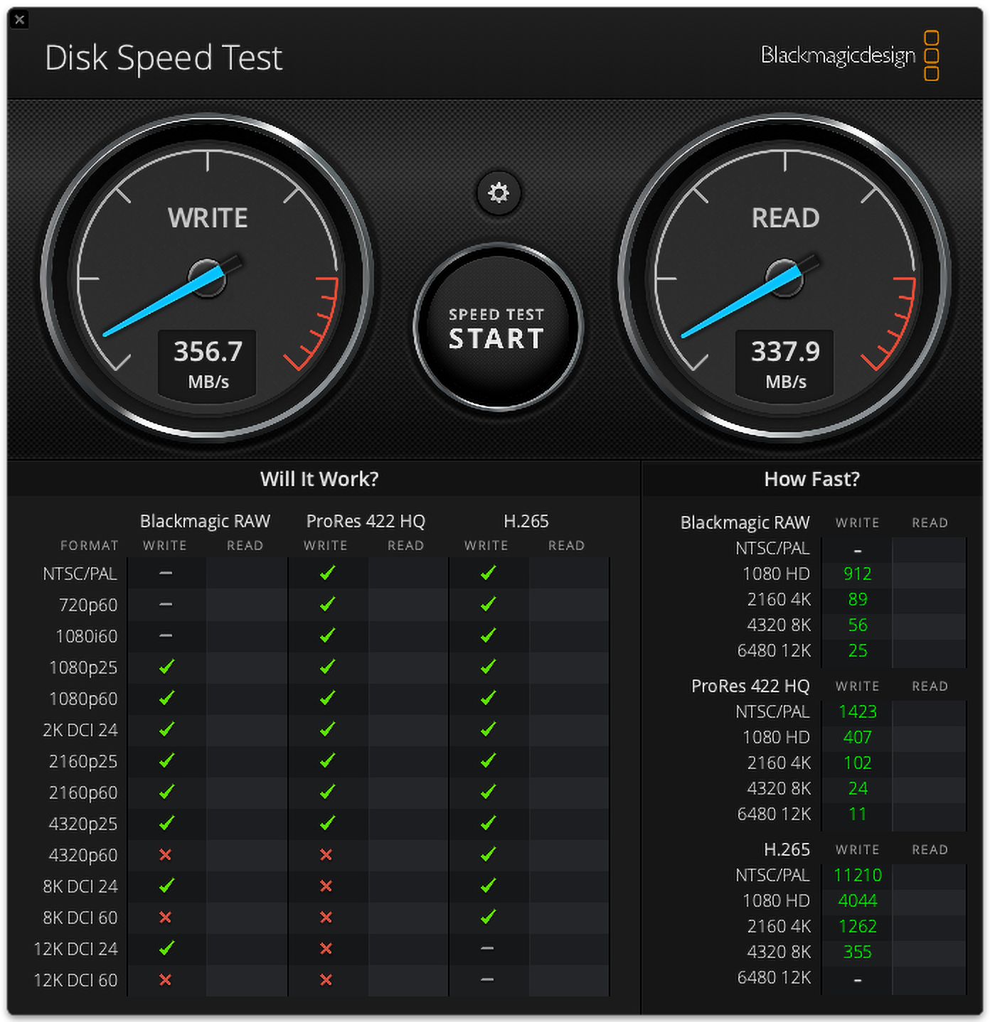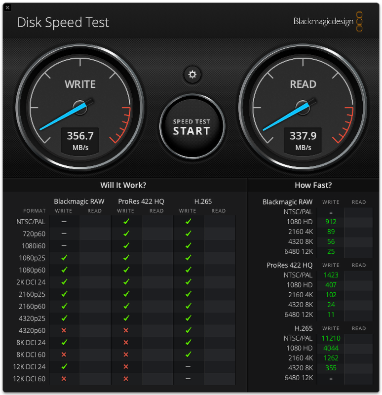 早速ベンチマークを取ったところ、古くなったメモリーの書き込み速度が38MB/sだったのに対し、新品は356MB/sと大きな差が出ました。この値であればメーカー公称値に近く納得のいく結果です。