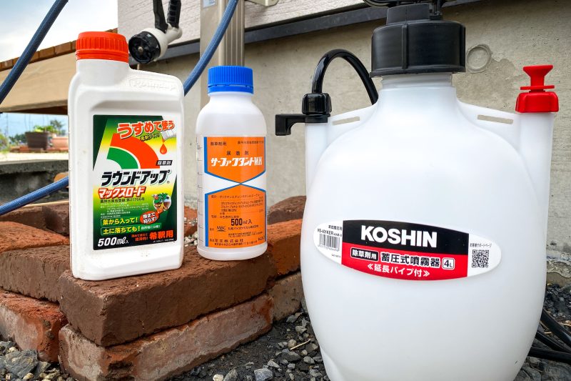 私はこれらの対策として除草剤とペアで展着剤で有名なサーファクタントを添加しています。写真にはラウンドアップとサーファクタントしか写しておりませんでしたが、安いグリホサート系除草剤はカインズホームで500円前後で購入できます。