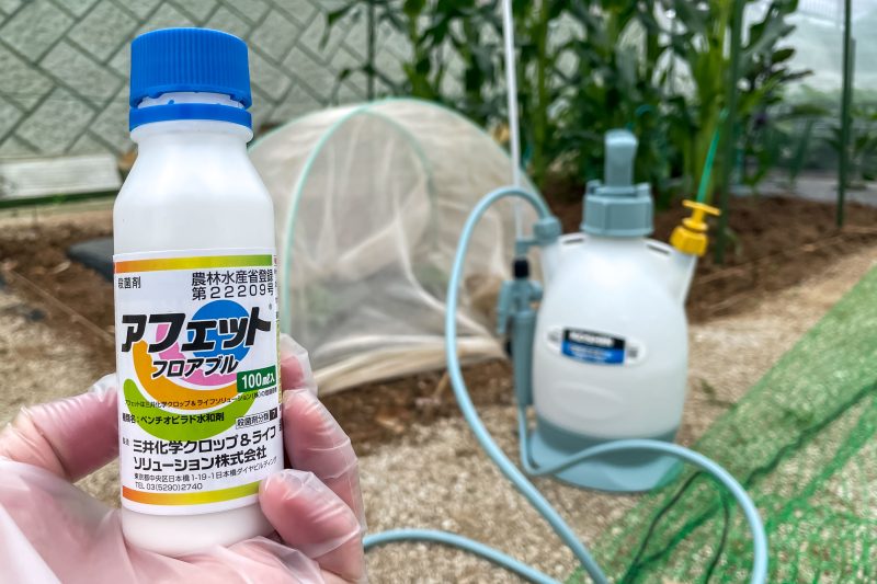 昨日、主にトウモロコシのアワノメイガ対策としてフェニックス顆粒水和剤なる殺虫剤を撒いたと書いたばかりですが、今日は殺菌剤のアフェットフロアブルを撒きました。こちらはその名の通り殺菌目的で、各作物が病気になるのを未然に防ぐ事が目的です。