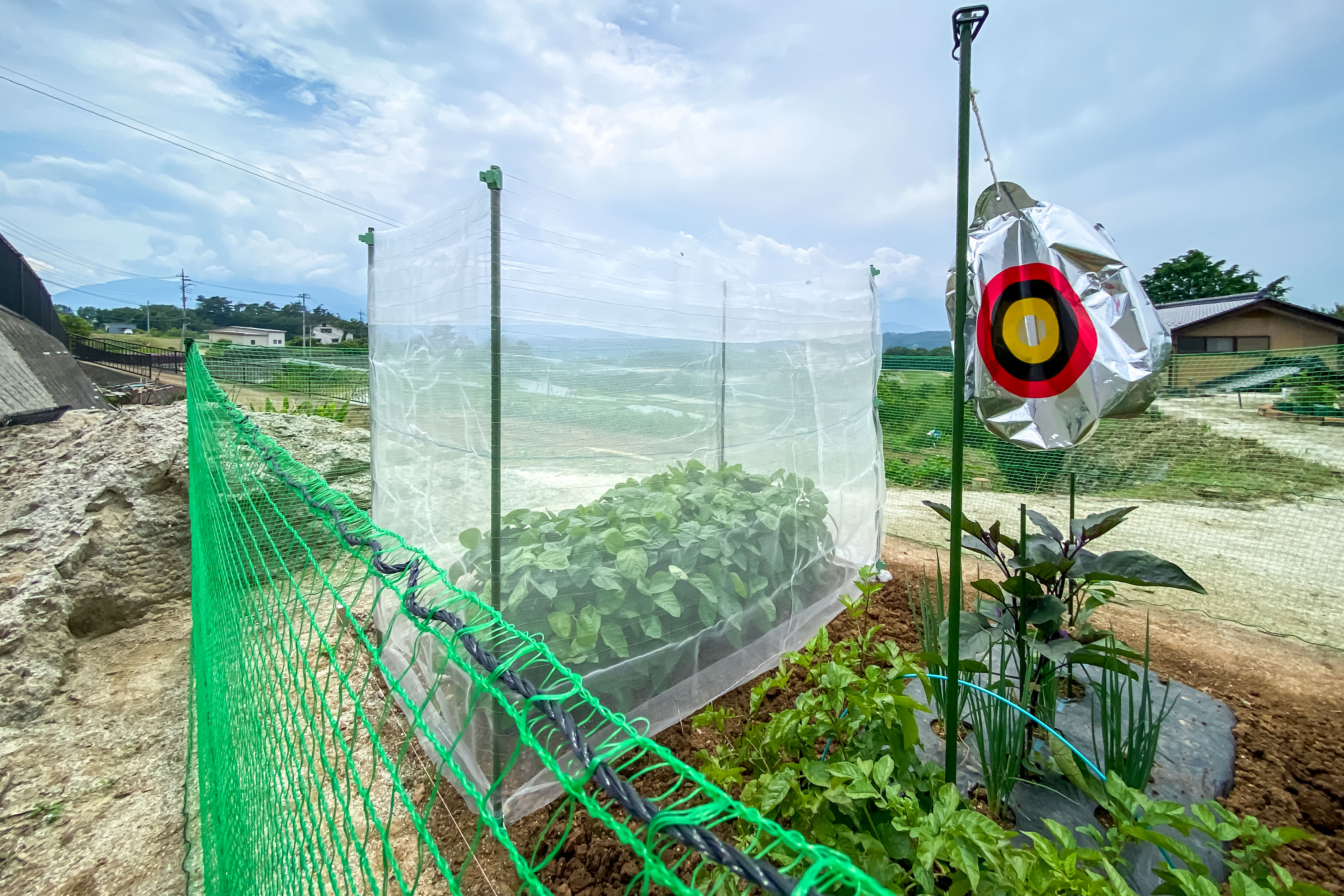 エダマメの畝にはこれまで防虫トンネルを掛けてきましたが、ここまで成長してくるともうぎゅうぎゅうになってしまって苦しそうですし、葉っぱがソーラーパネルのように太陽の方を向いていてくれないと光合成の効率が下がり成長が妨げられると言われますから、この週末を境にトンネルを外し代わりに防虫ネットで周囲を四角く囲うこととしました。普通はトンネルを外したらもう完全開放すると思うのですが今年は昨年以上にカメムシが大発生すると言われていますから、こちらも予防的措置です。