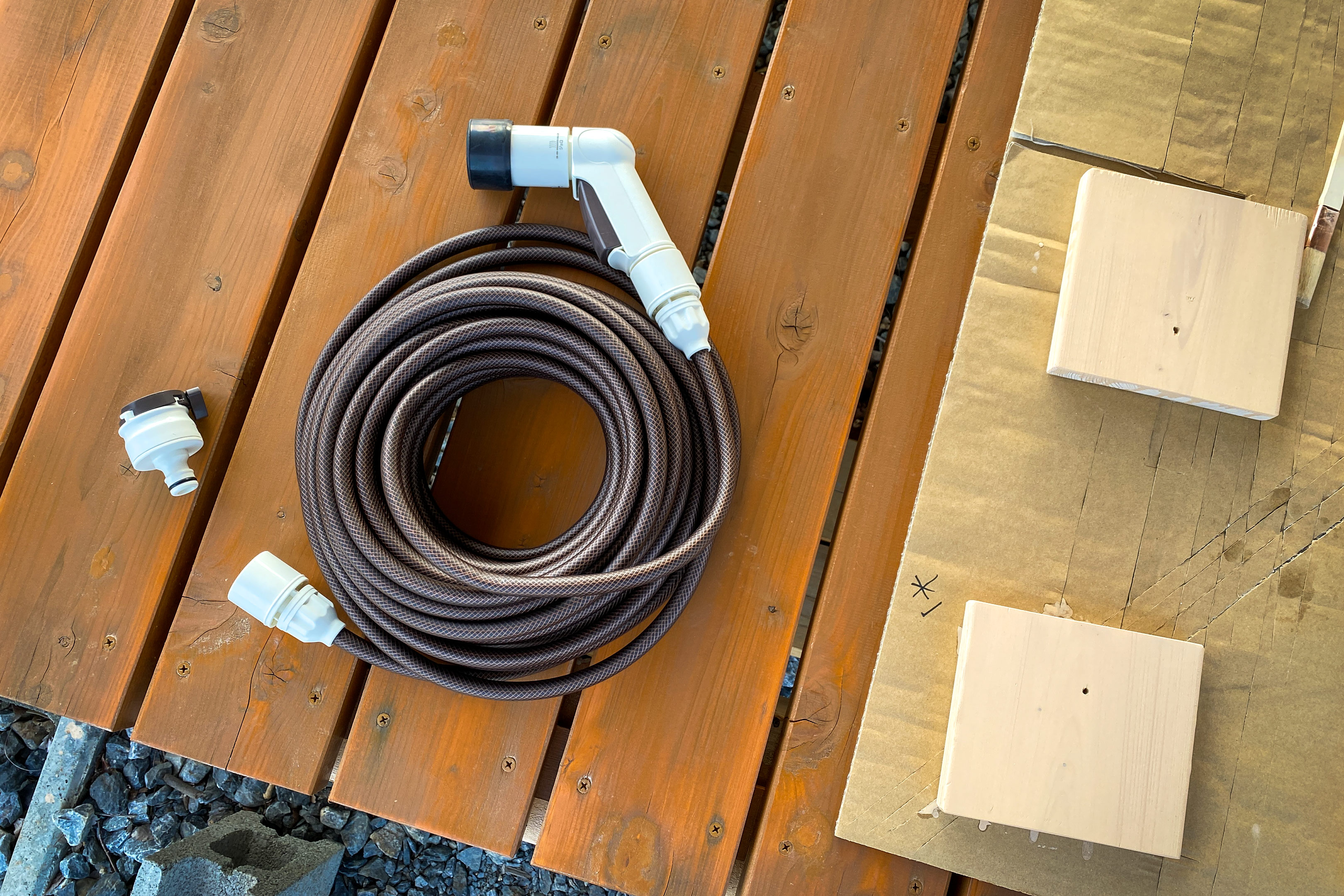 外径11mm、内径7.5mmという細いホースの長さ15m。色はなんでも良いですが苔が生えないよう透明ではない素材。この条件を満たすものってAmazonや楽天でも販売されておらず、ホームセンターなどでも店頭で見かける事はありませんでした。長さ10メートルなら売っているんですけどね、15メートルとなるとホースリール付きのものしか販売されていないのです。どうしても欲しければそのホースリール付きを購入するしか無いのですが、正直リールって要らないんですよね。冬場に凍結しないようホース内の水抜きをするにはホースだけの方が扱いやすく...。