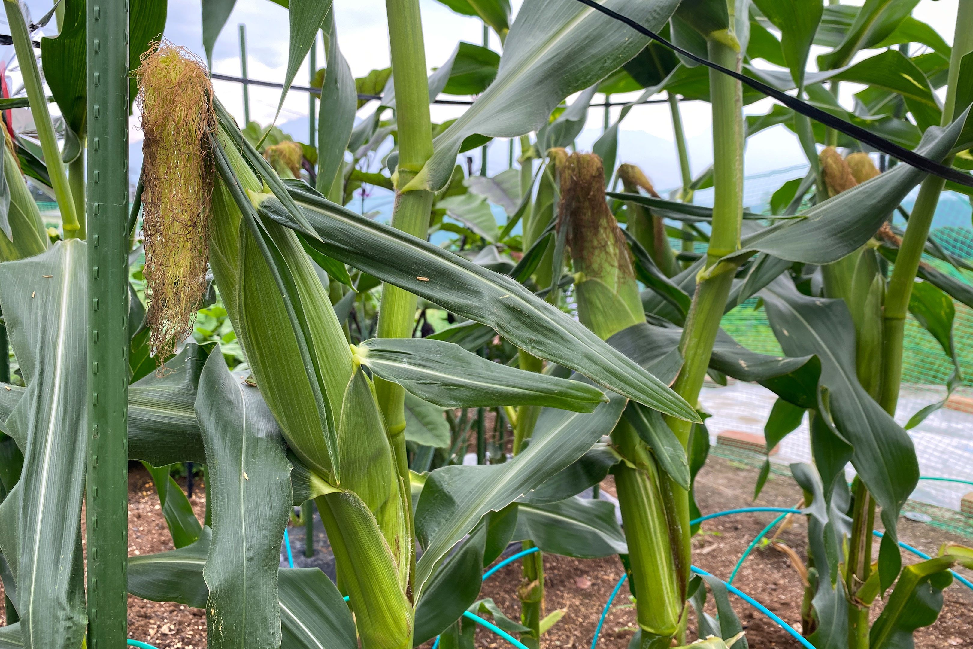 トウモロコシも良きタイミングです。今年育てた品種は1粒ずつがプリップリで甘いプレミアム未来。この品種は種を蒔いた日を基準に85日後が収穫時期の目安とされていますが、我が家はそれ基準で計算すると7月6日が予定日でした。