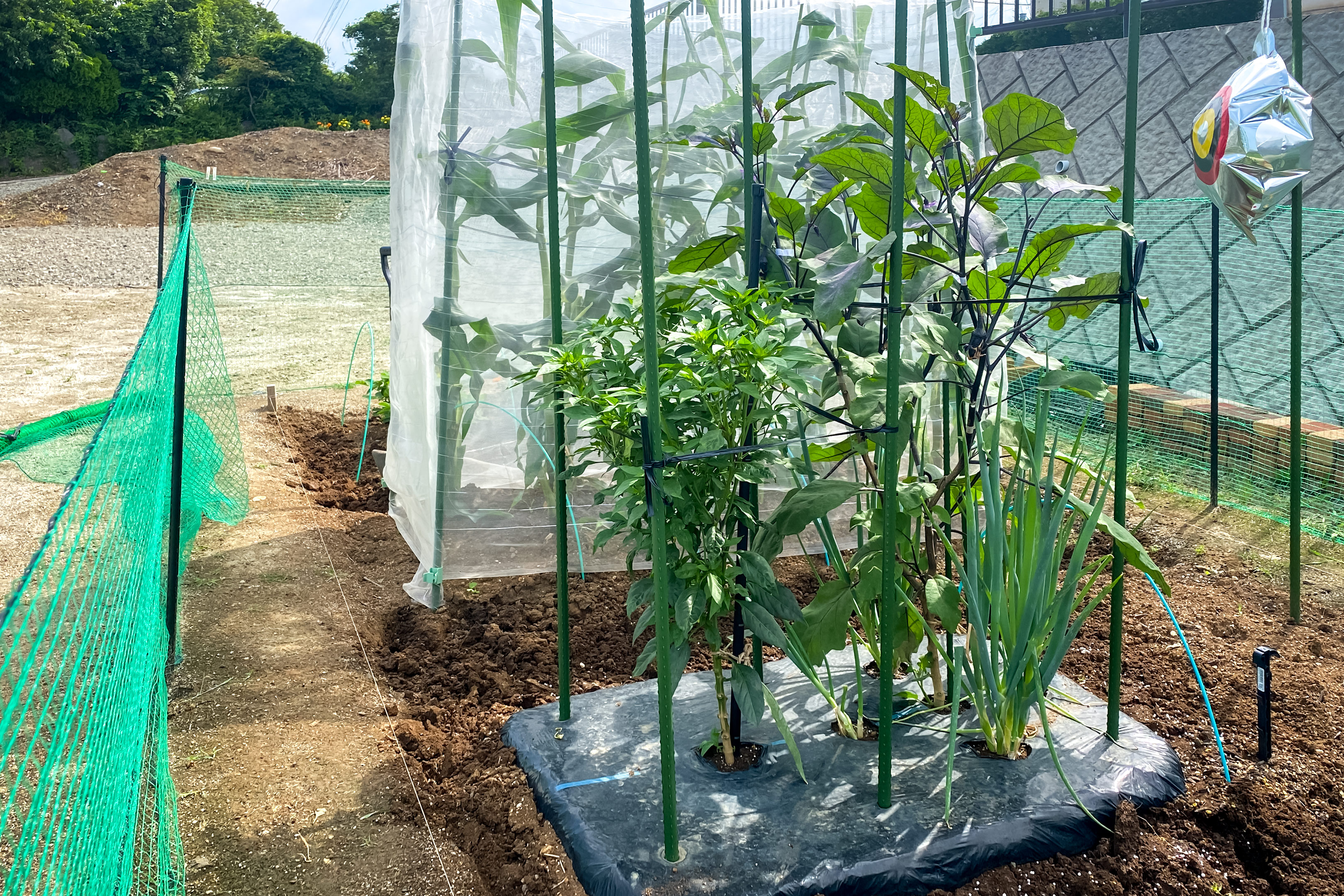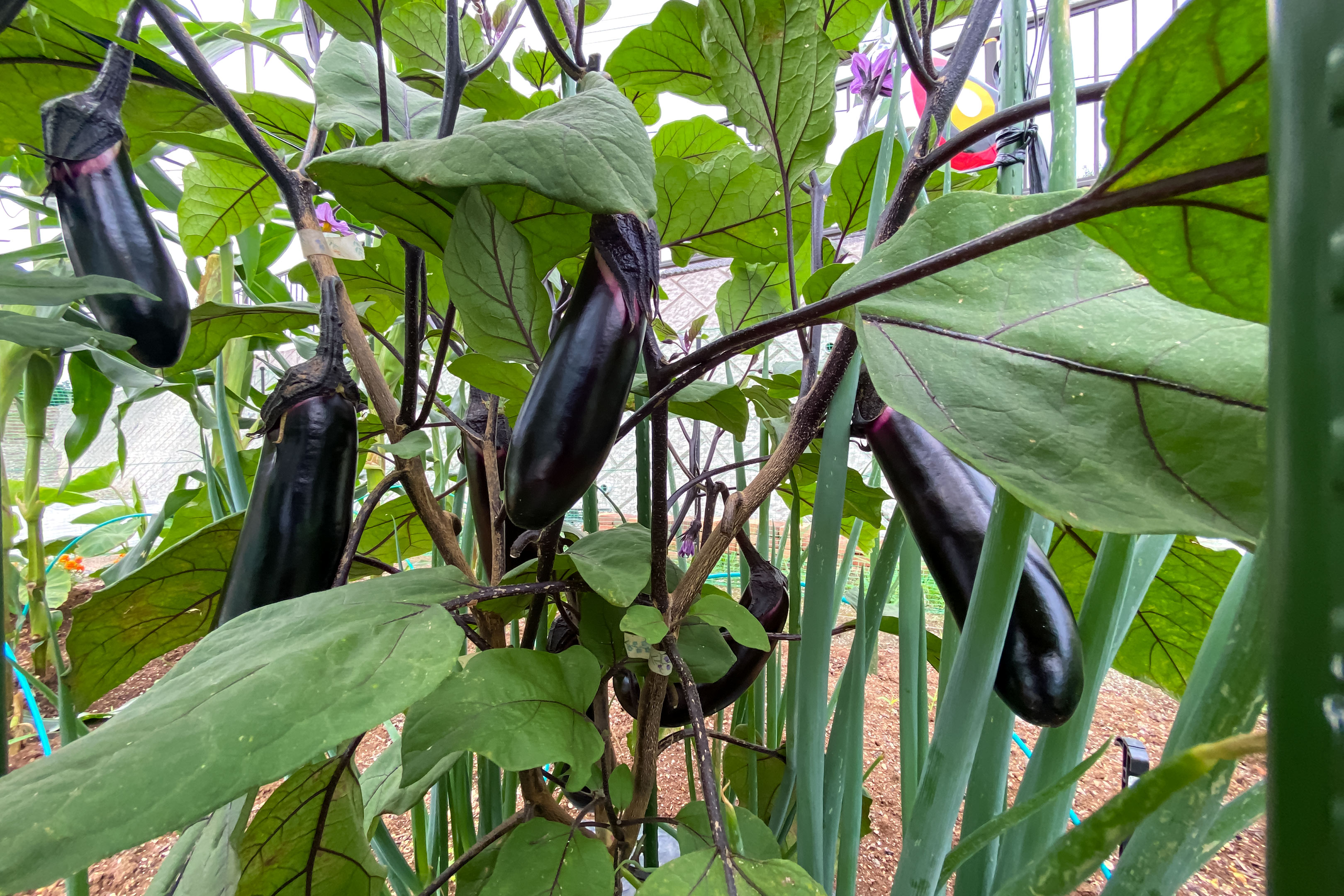 ナスもいよいよ本格的に収穫開始です。まだ主軸は摘芯していませんから今後しばらくは背が伸びますし主軸についたナスの収穫がメインですが、すでに数本は脇芽についたナスも採れ始めていますから順調に軌道に乗れた感じです。