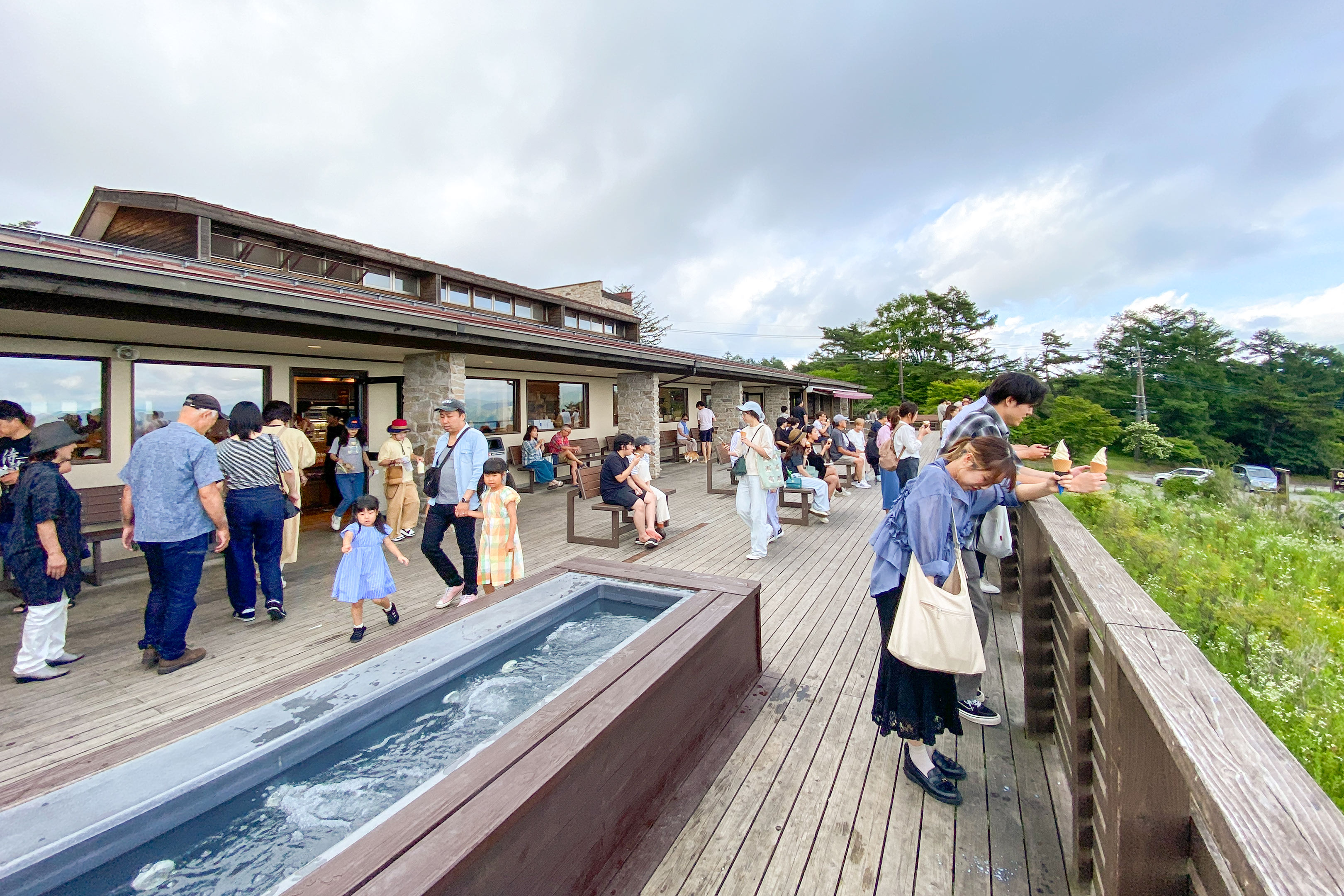 テラス内には足湯ならぬ足水が準備されており、湧き水が豊富な山梨を象徴するように一般開放されております。夏の暑い時期なら多分気持ちよく利用できると思いますが、曇天かつ標高1,400メートルの夕方ですから空気は十分涼しく、この日に限って言えば水に足などつけたら寒くて...。