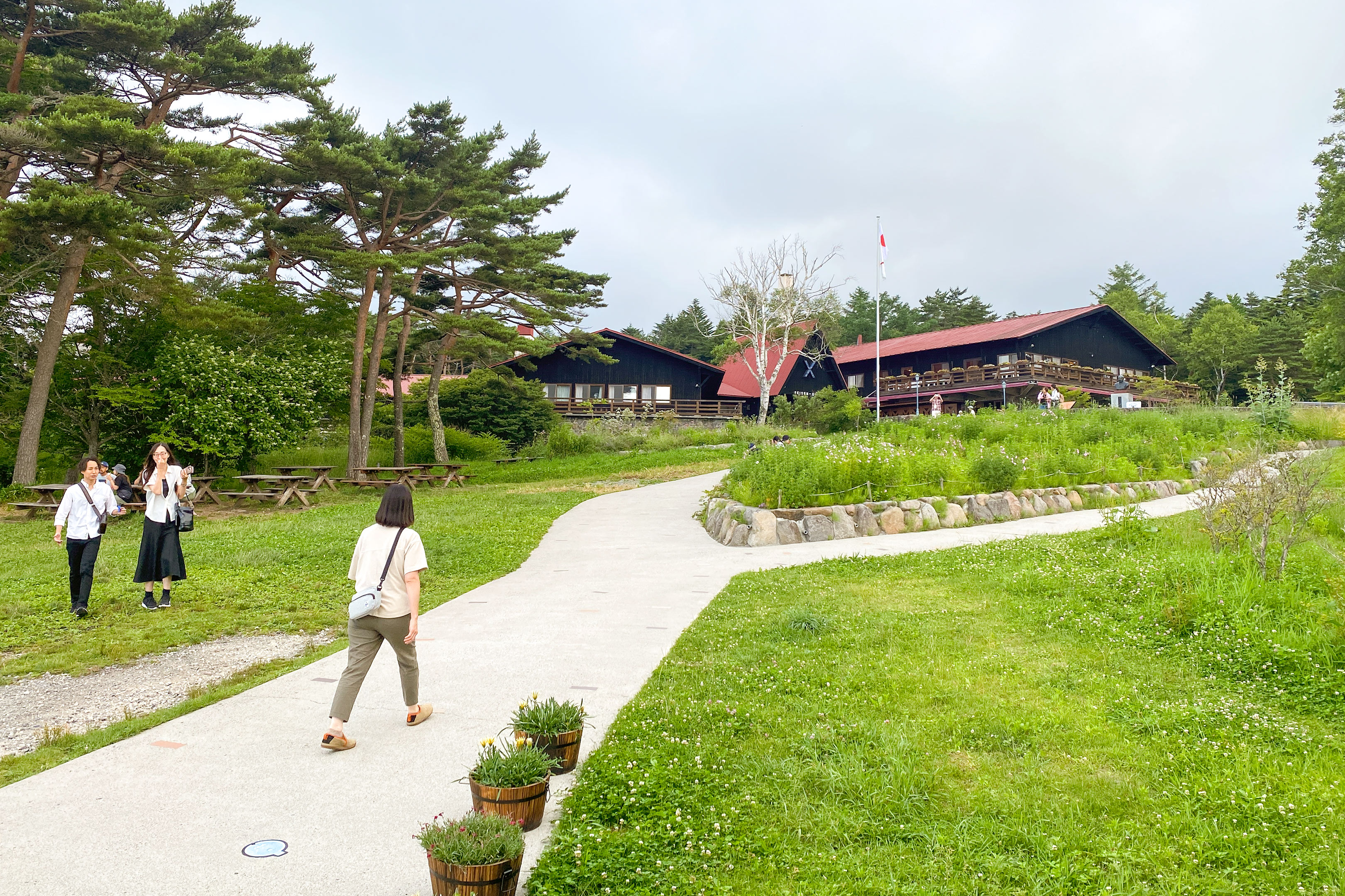 各地に点在するスキー場に作られた近年流行のテラスのように、ここ清泉寮にも富士山や南アルプスを一望できるテラスが設置されておりました。あいにくこの日は天候に恵まれず曇天でしたので遠景は望めませんでしたが解放感は変わりなく広大な敷地を味方につけます。