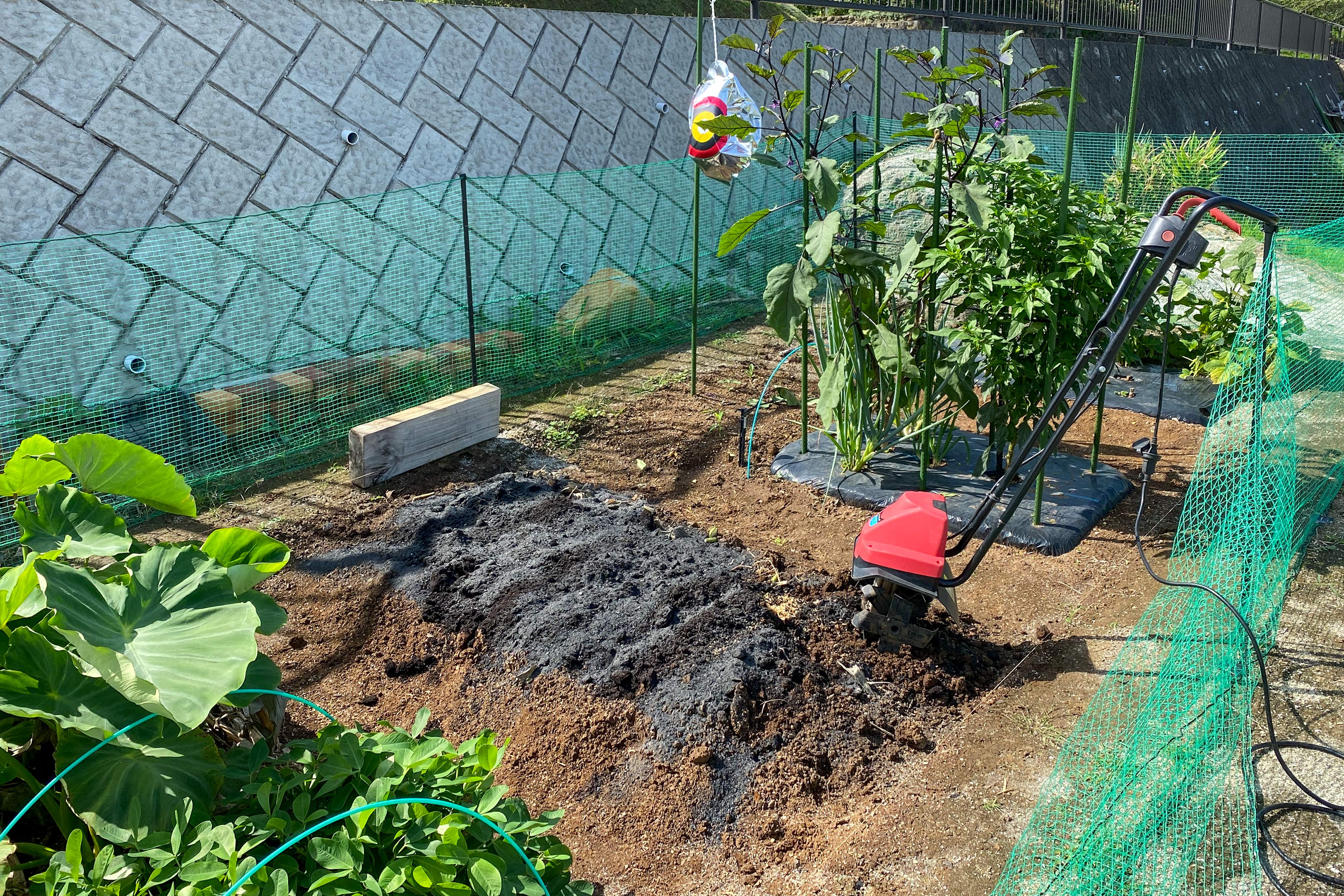 35℃を超えるような真夏の畑をクワ一つで耕していたら熱中症の危険が高まりますから今回は最初から電動耕運機で一気に攪拌しました。周囲に土が飛び散る点を除けば最高に良い仕事をしてくれるので、小さな家庭菜園には強い味方として大変助かっています。