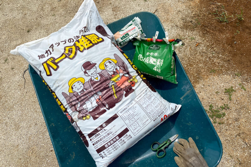 また、以前も書いた通り我が家の畑はいまだに粘土質土壌ですからバーク堆肥は今回も多めに入れます。一畝に対し15〜20リットル。普通は5リットルくらいしか入れないんじゃないかと思います。