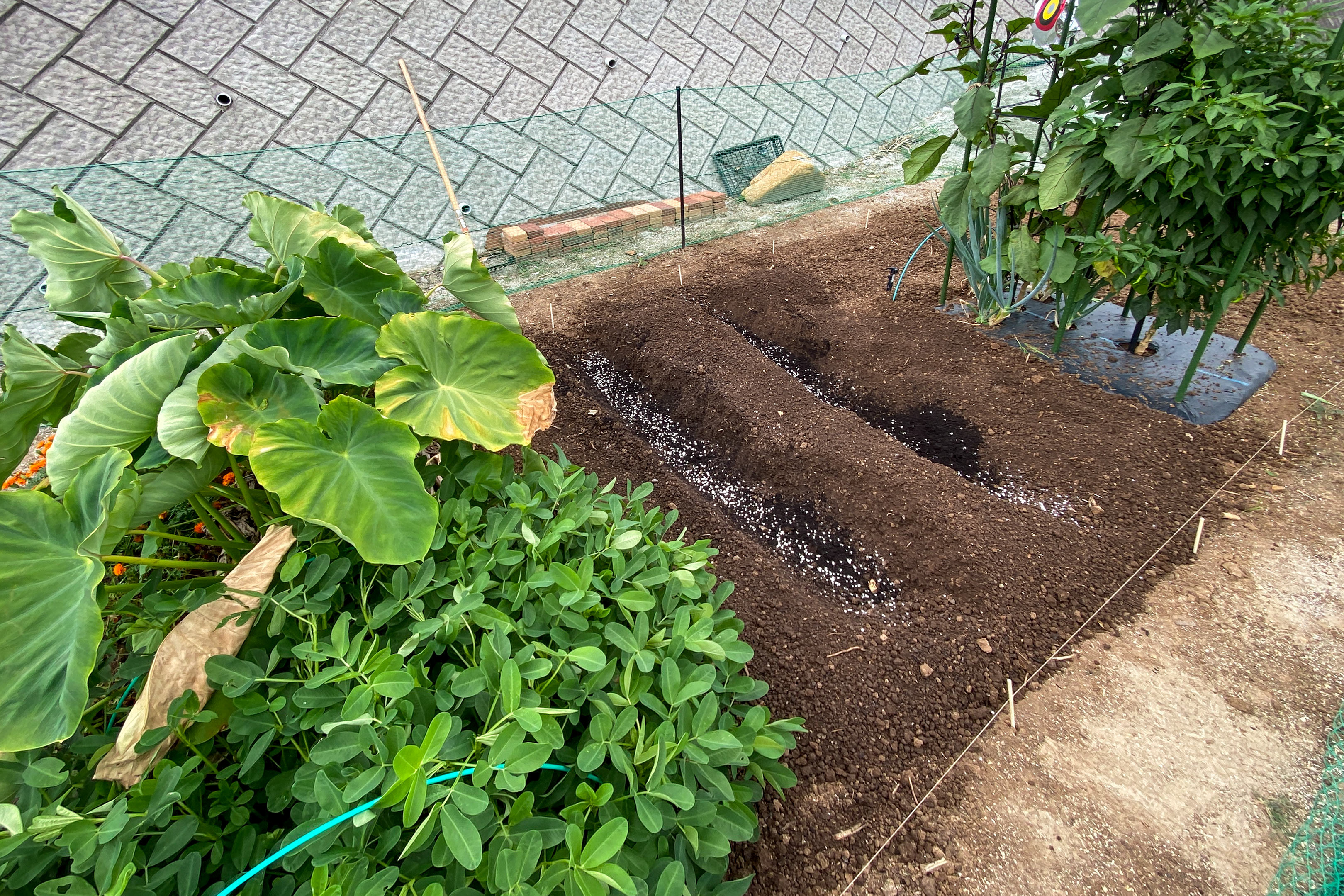 全面散布で一気に耕す際は電動耕運機に頑張ってもらいますが、このような溝施肥となると結局はクワによる手作業ですから夏の暑さが応えます。