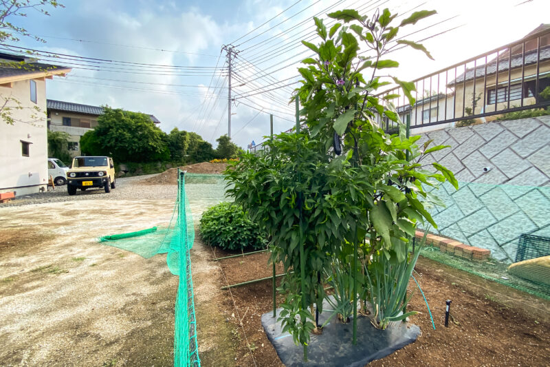 ナスとシシトウだけが植っている畝。下の方に見えるネギはナスのコンパニオンプランツとして植えてあるワケギです。これはこれで何かと料理に使えるのでちょっと植えてあるだけで重宝します。