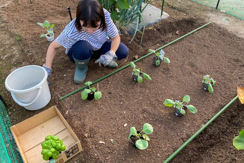 2週間前に準備しておいたキャベツ・ハクサイ定植用の畝に今回の苗を植え付けます。ハクサイの定植はまだ2週間以上先ですので今回はキャベツのみ。