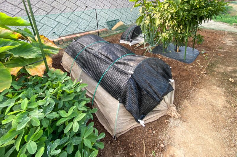 これもどの程度濃いものを使うか、そしていつまで掛けておくかの匙加減が難しく、あまり光を遮ってしまうと苗が徒長して弱くなるでしょうし、雨が降っても苗にまでうまく雨水が届かなくなってしまうというリスクもあります。