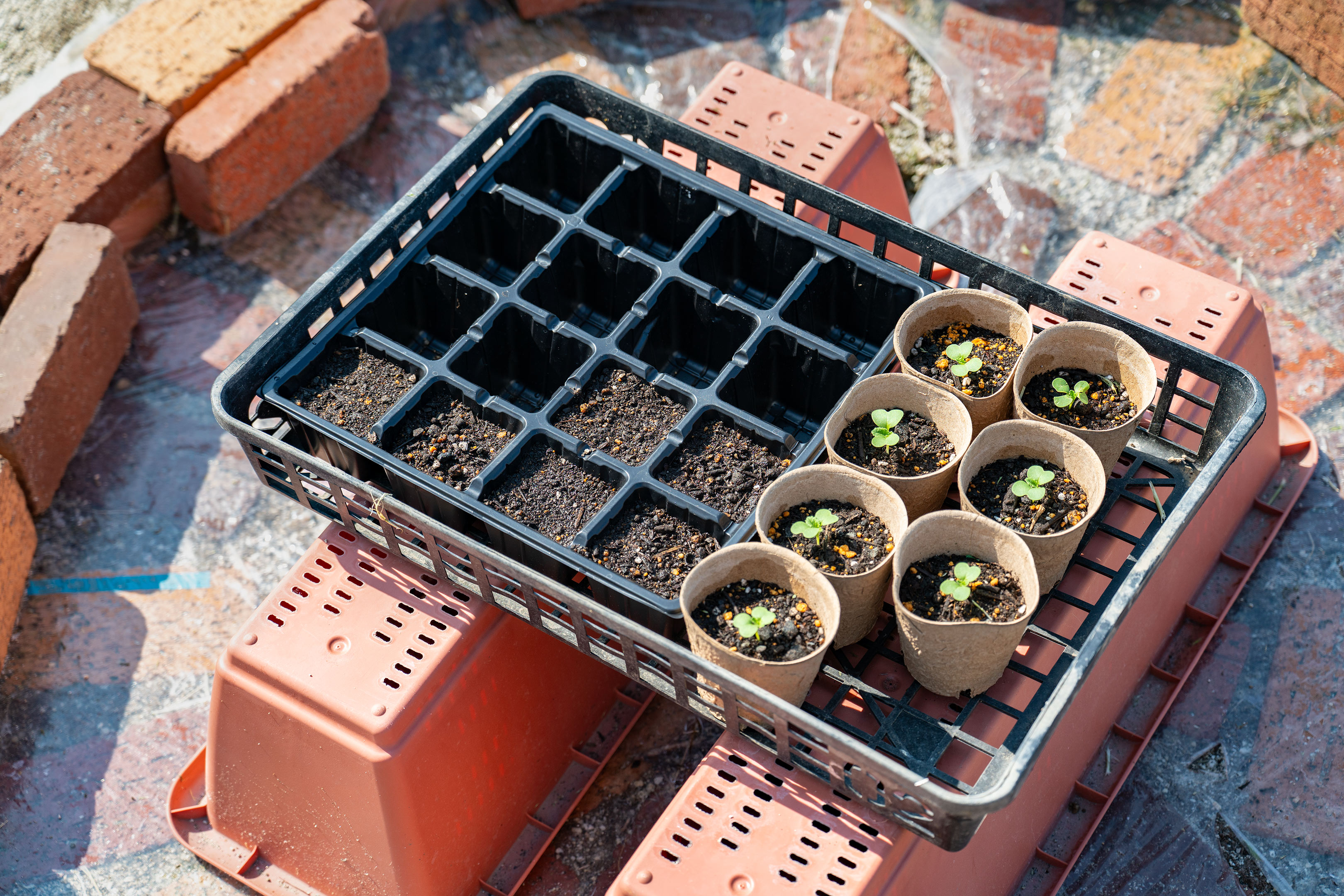 上の写真では丸いポットに植えてあるものが1週間前に種を蒔いたもの、黒い種まきトレイに植えてある6ポット分が今週蒔いたもので、つまりは1週間のずらし蒔きによって定植時点で丁度よく成長した苗を使おうという考え。