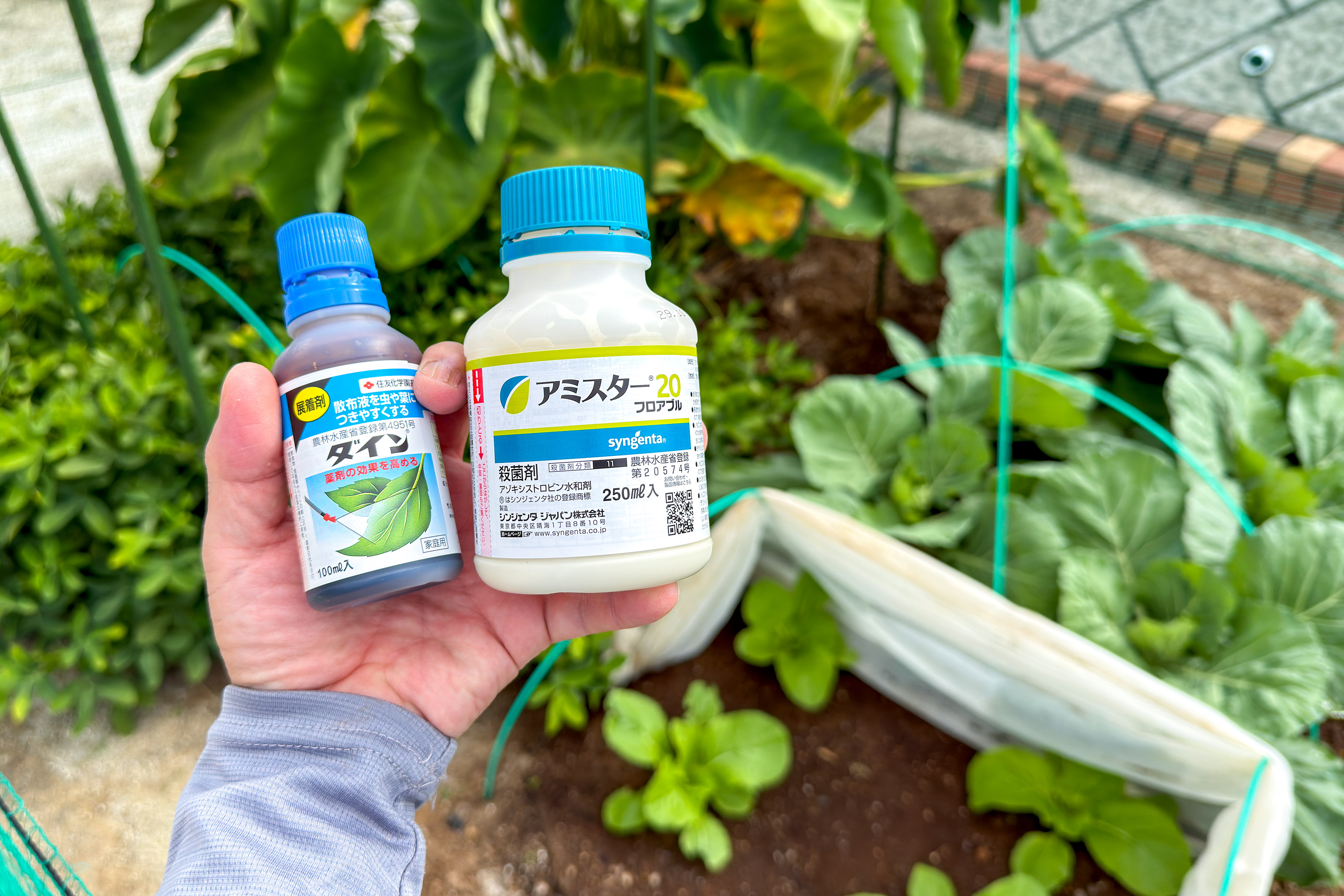 我が家は昨日、春夏野菜のナスとシシトウを撤去したばかりですが、実はナスの葉っぱにはわずかにうどんこ病の症状が出ていたのを確認しており、それらは既に畑から撤去したとはいえ、うどんこ病は簡単にいうとカビですからその胞子が隣の畝のキャベツや白菜に感染すると厄介なので、今回は転ばぬ先の杖という事で殺菌剤(アミスター)を散布したというわけ。