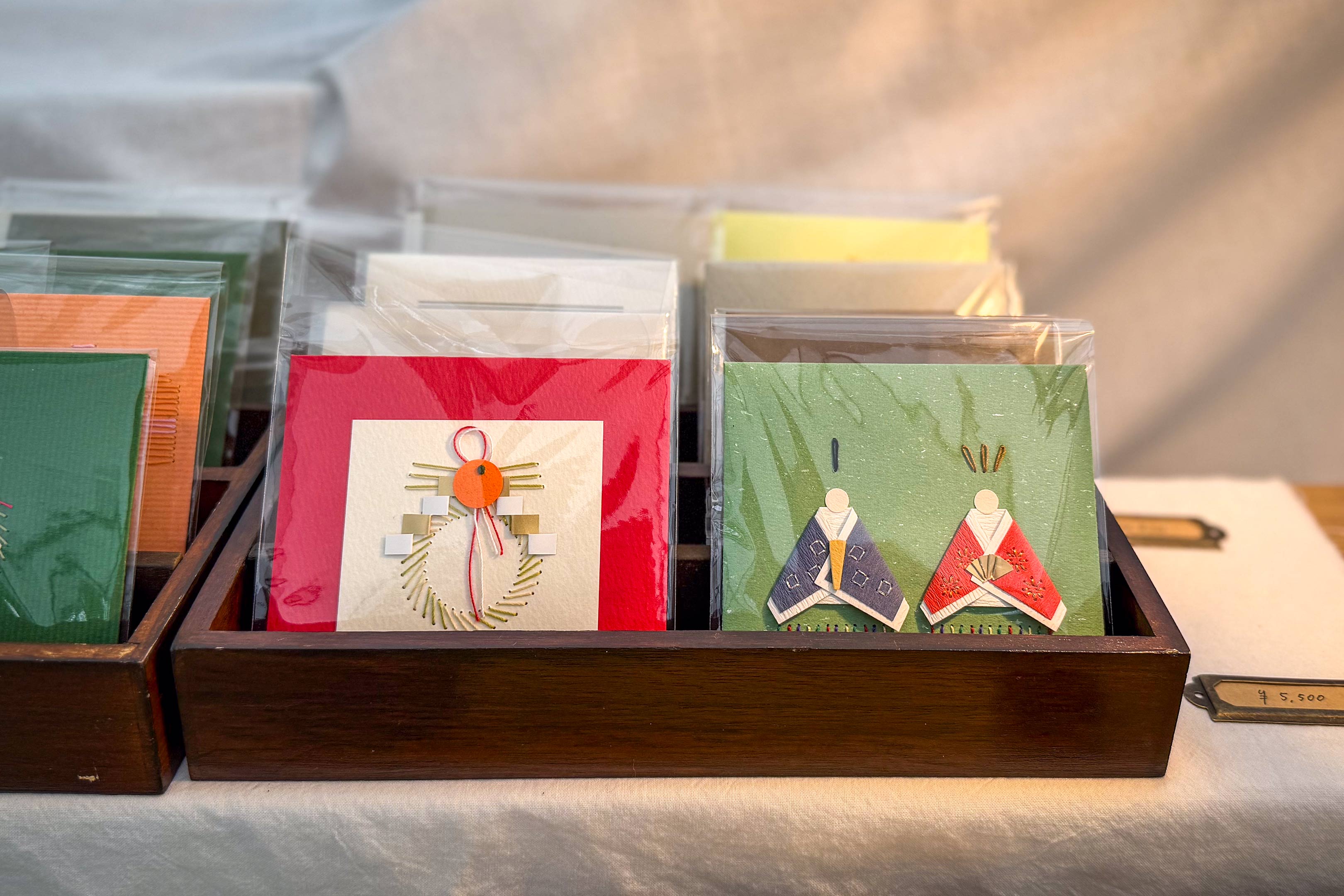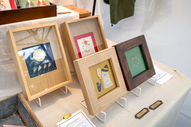 紙のベースに対し刺繍で絵を描いている作品なのですが、シンプルながら大変わかりやすく色使いも上品でデスクの上にちょんと置いておきたくなるアイテムでした。日本の四季をうまく表しており、バラ売りされている刺繍部分を差し替えて季節ごとに入れ替えられる点も魅力的。