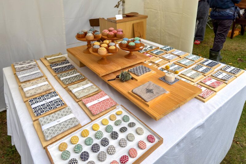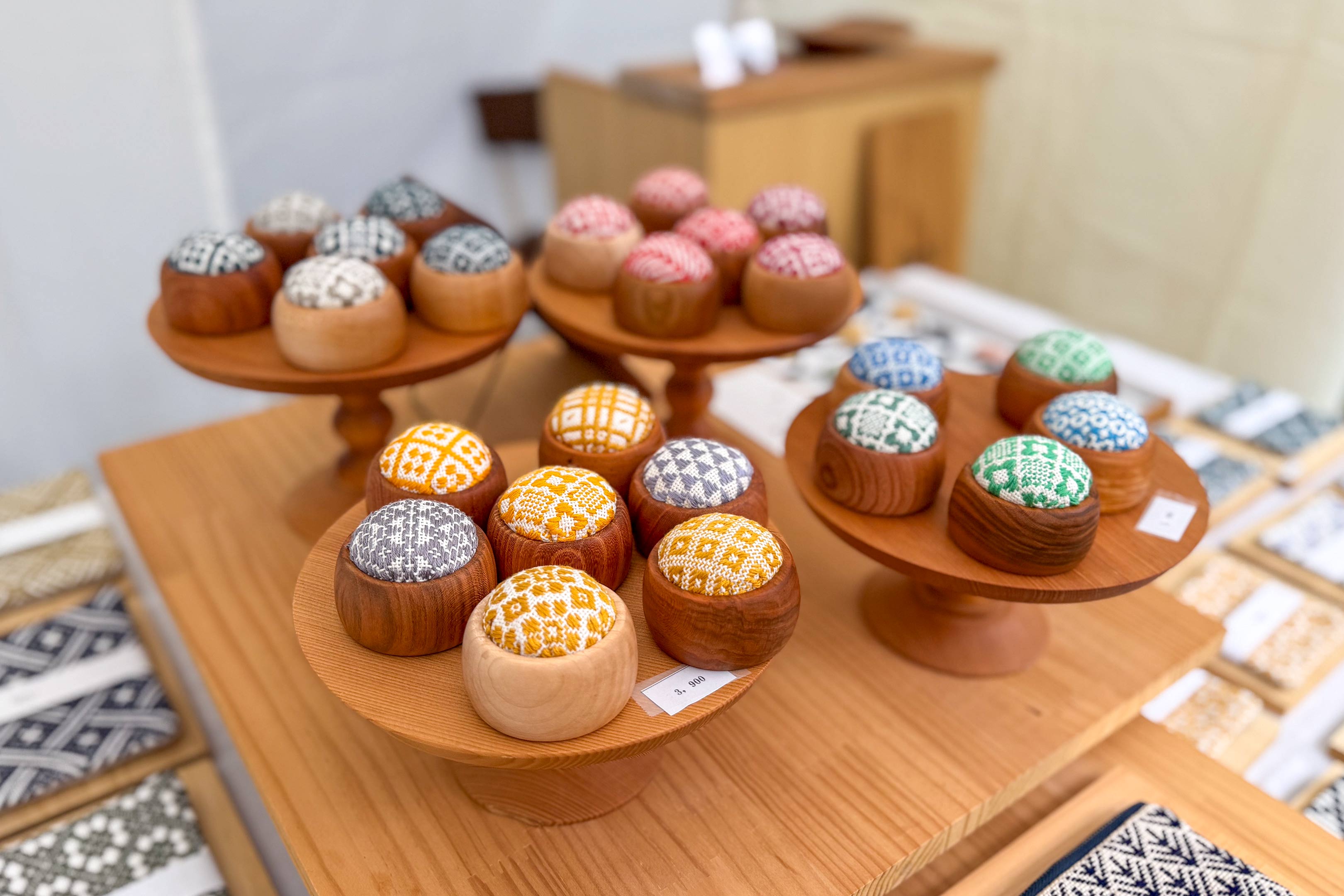 聞けば下半分の木で出来た部分は別の作家さんの手によるもので、その土台に対しこの刺繍作家さんが上半分のピンクッション部分を追加して一つの作品として成り立っているのだとか。刺繍の柄とカラーにバリエーションがあるのでそれだけで見栄えが良いのですが、この土台部分の木の素材もいくつか準備されていて大変魅力的でした。