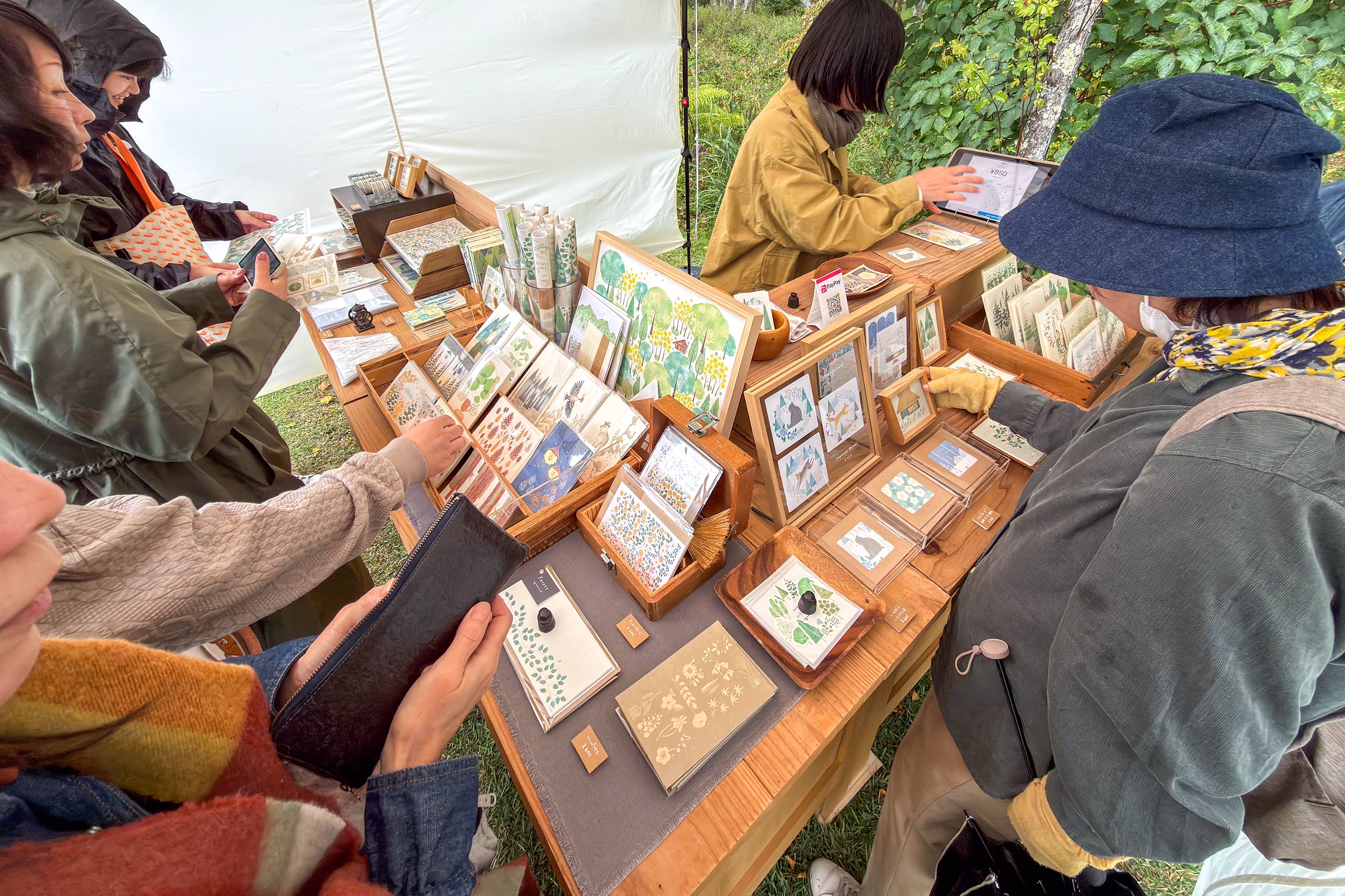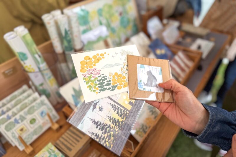 今回我が家が唯一購入した作品がこちらの画家さんの描いた絵。水彩画と思われる優しい絵柄は八ヶ岳の自然にうまくマッチしており、サイズとアイテムのバリエーションも豊富。ブースには常に人だかりが出来ているのも頷けました。