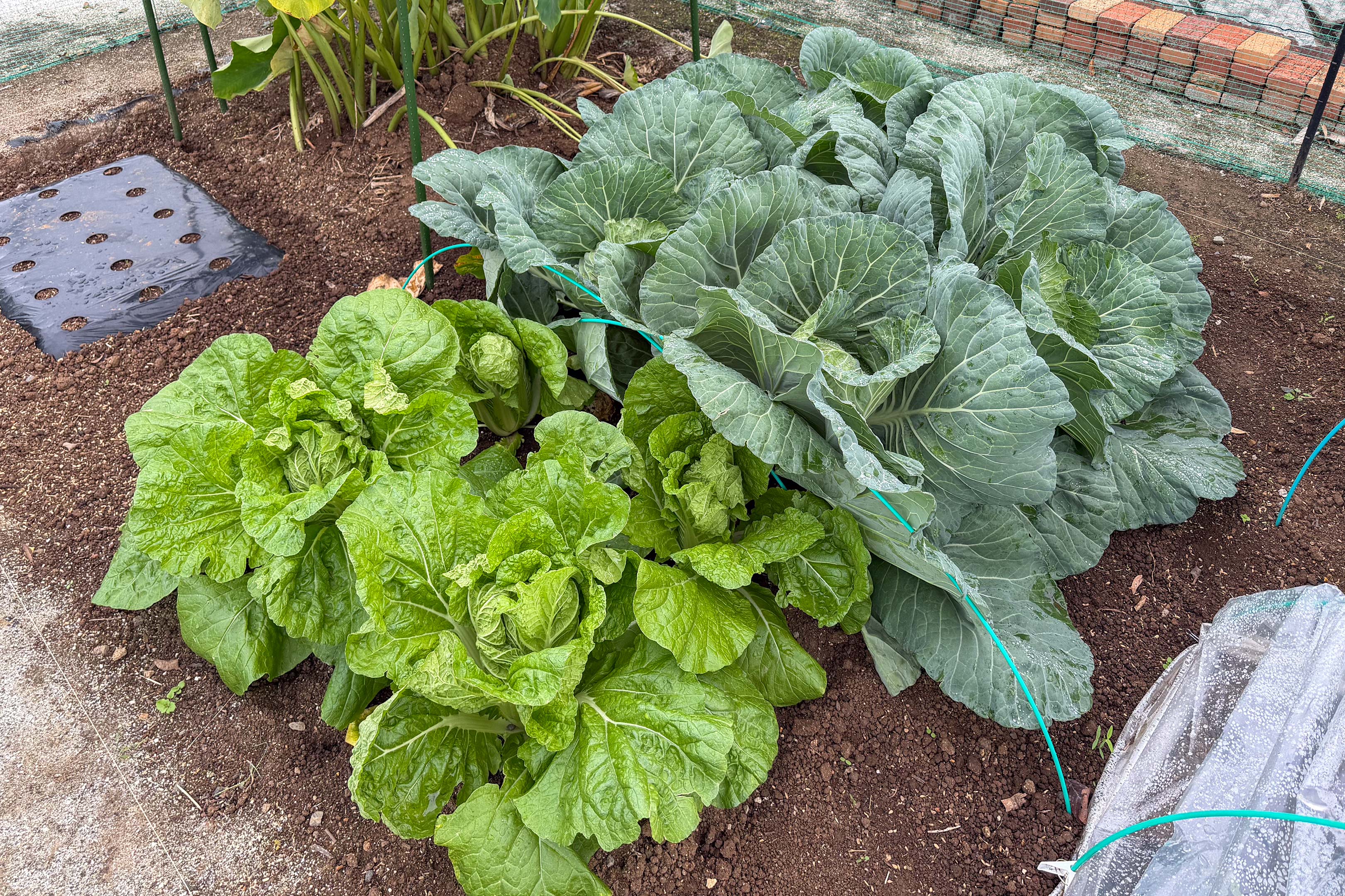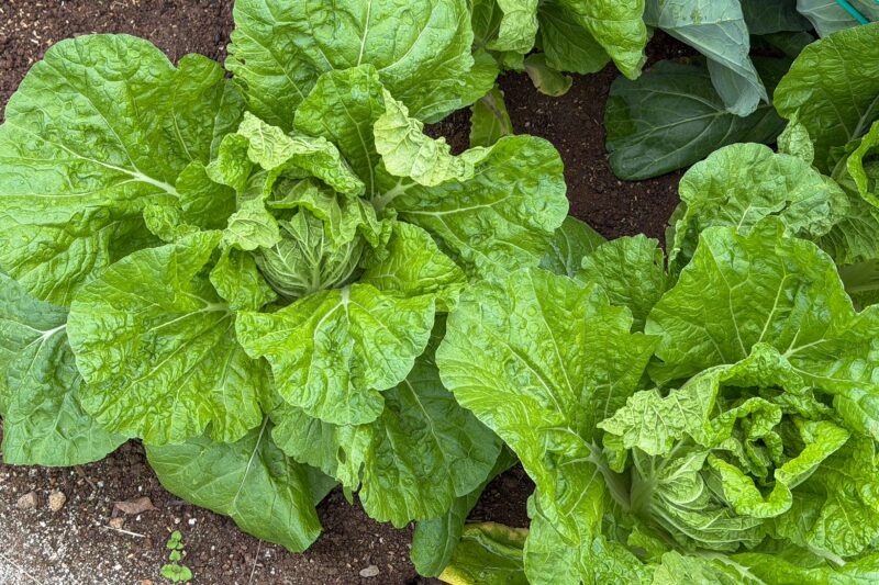 キャベツと白菜の様子。早いキャベツはこの週末に収穫時期を迎えましたが、サイズ感と手で押さえた時の硬さからしてこちらはあと1週間待って収穫するつもり。