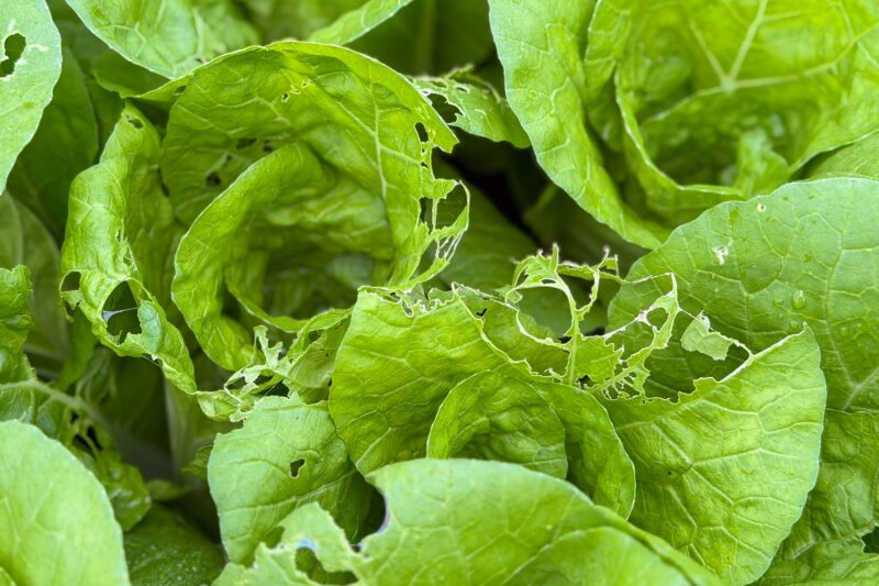こちらはミニミニ白菜のタイニーシュシュ。先週の時点で結構虫に食われており、ここ最近は毎週のように農薬を撒いていましたが、この週末になって更にその被害は進み酷いところはご覧の有り様。