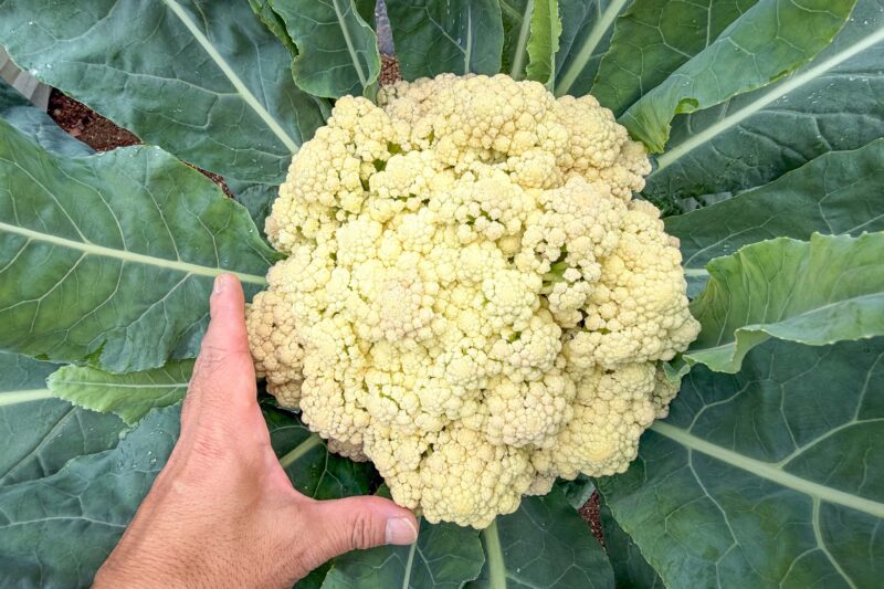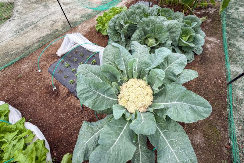 カリフローレはそろそろ収穫の時期となりました。イメージとしてはもう一回りくらい大きくなりそうですが、もう花蕾の根本の茎の部分が少しずつ伸び始めていますから、確かにまだ大きくはなるもののこの段階で食べ始めないと後半は食べきれなくなります。ちょうど今このサイズが人の顔くらいですかね。
