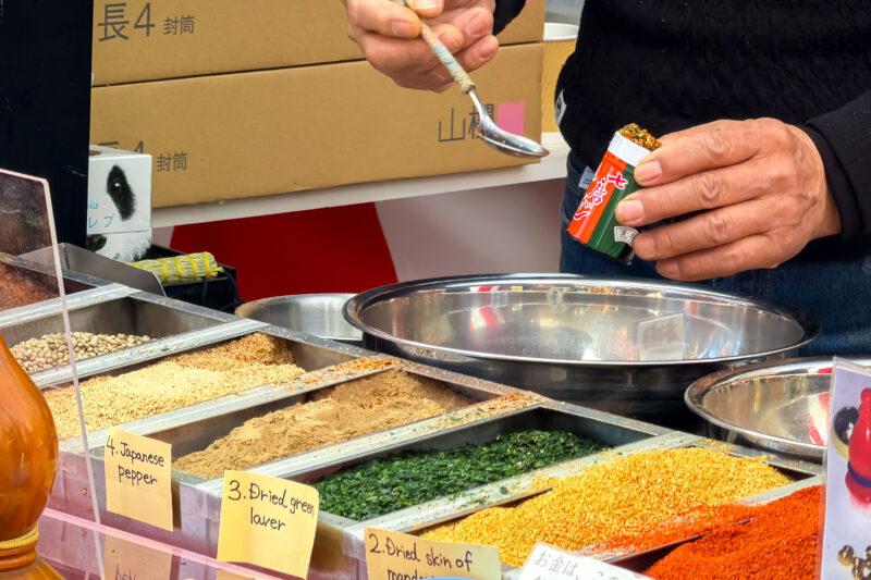 全国には有名な七味唐辛子は数あれど私が知る限りここで手に入る七味唐辛子は唯一無二、七味唐辛子の概念を覆すレベルで美味しいのです。辛味を求めるというよりは文字通り ”七味” を味わう感じ。大国魂神社の屋台として出店しているおじさんのブレンドの場合は青のりの風味が際立つのが特徴。