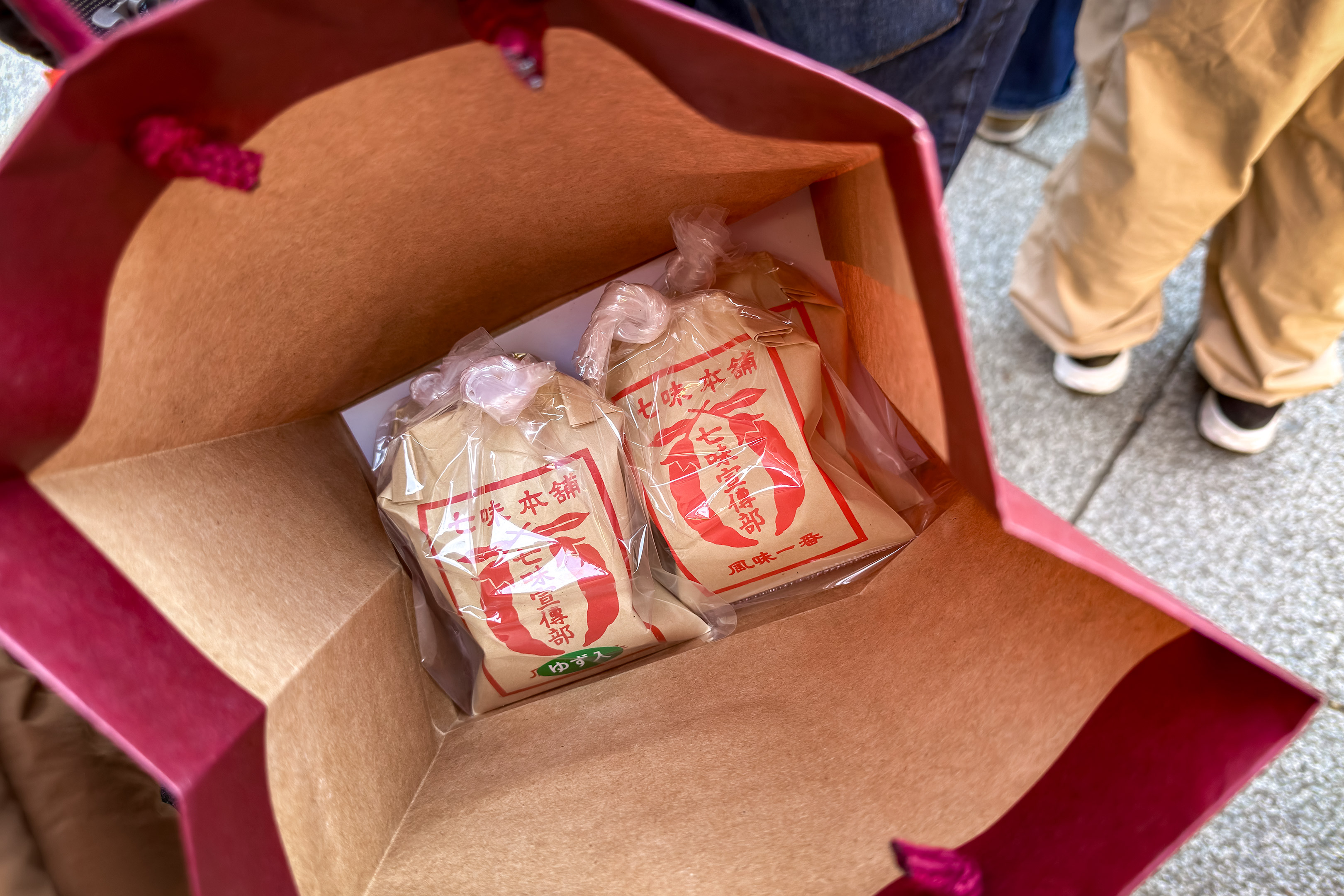 購入したのは辛さを控えめの調合をベースに、柚を増し増しで追加した柚子七味と、ニンニク増し増しで追加したニンニク七味。それぞれ2袋ずつで合計6,000円オーバー。逆にいうと6,000円払ってでもこれだけは購入しておきたい七味唐辛子というわけです。自宅で使用するのはそれぞれ1袋ずつですが必要量の2倍も購入した理由はお世話になっているご近所さんへお配りする分。