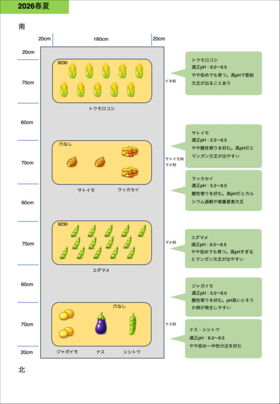 ちなみに2025年の計画表には各畝への元肥の量などが記載してありますが、投入する肥料の種類と量は我が家の菜園用であり、一般向けではない点にご注意ください。我が家はこの畝作りの前に約2ヶ月間の土づくり期間を設けており、その時点でもここに記載していない肥料、堆肥、土壌改良剤を使用しています。また、2026年版にはそれら肥料の割合は記載せず、各作物に適したpHの値を記入しています。種まきや苗の定植をする前の土づくりではこれらpHの値を畑で計測し調整していきますから、石灰や肥料の量を記載するより基準pHをわかりやすく記入しておいた方がその時々で便利なのです。