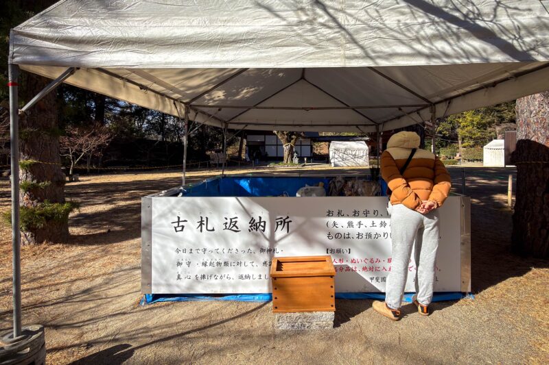 この日の目的だった締め飾りの返納も無事完了。ここに集まったお守り、お札、締め飾りなどはいずれまとめてお焚き上げされるのでしょう。以前どこかの神社へ持って行ったら境内の裏にあるゴミ箱の段ボールを案内された事がありショックを受けましたが、武田神社の古札返納は大丈夫そうです。