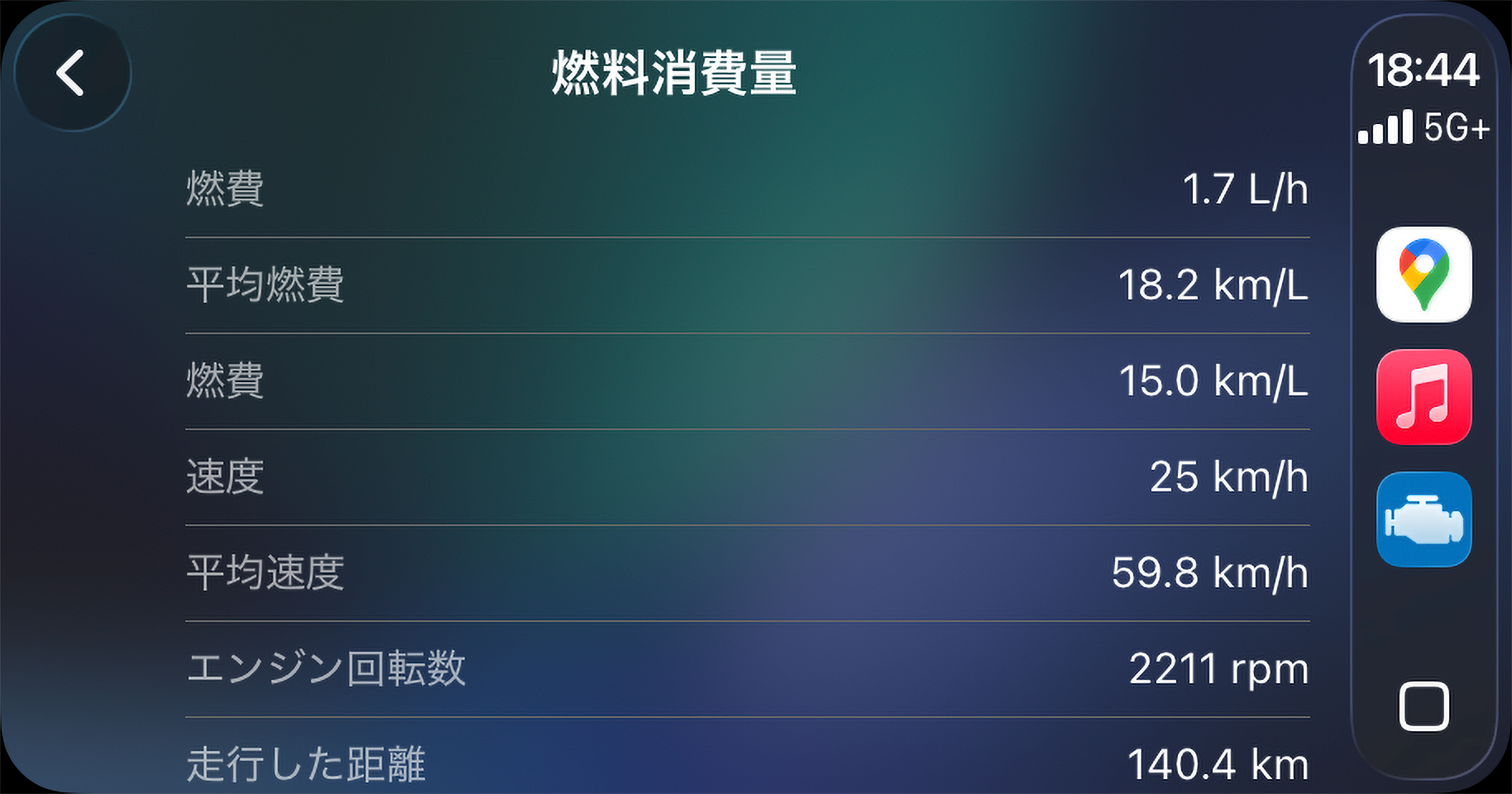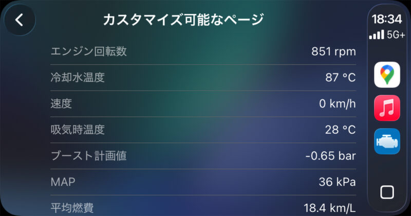 今回使用するのはCar Scanner ELM OBD2なるアプリでして、このアプリ実行時にiPhoneがCarPlay接続されているとジムニーのディスプレイオーディオには上のスクリーンショットのような表示を出すことが出来ます。勿論CarPlayですからGoogle Mapによるナビも、音楽再生も、LINEも、電話も、全てこの画面内で完結。実にシンプルでよろしい。