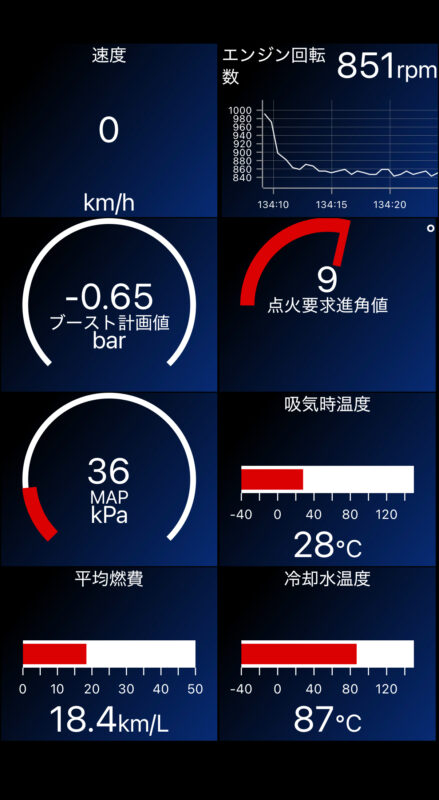 あと、これは私の勉強不足かもしれませんが、ブースト圧に関しては社外品のような1.0kgみたいな値が表示されません。選択していたOBD2のプロファイルの問題かと思いジムニー用プロファイルにしてみましたがダメでした。