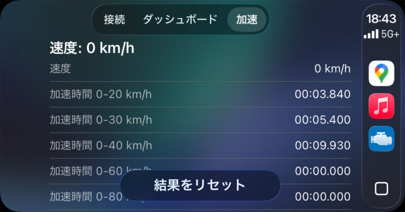こちらはジムニーに乗っていると無縁とも思える加速計測。車が停止している状態で数値をリセットし、そこから発進すれば自動的に各速度域のタイムを計測してくれます。