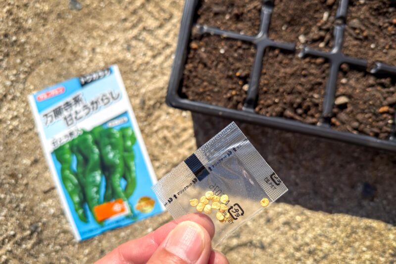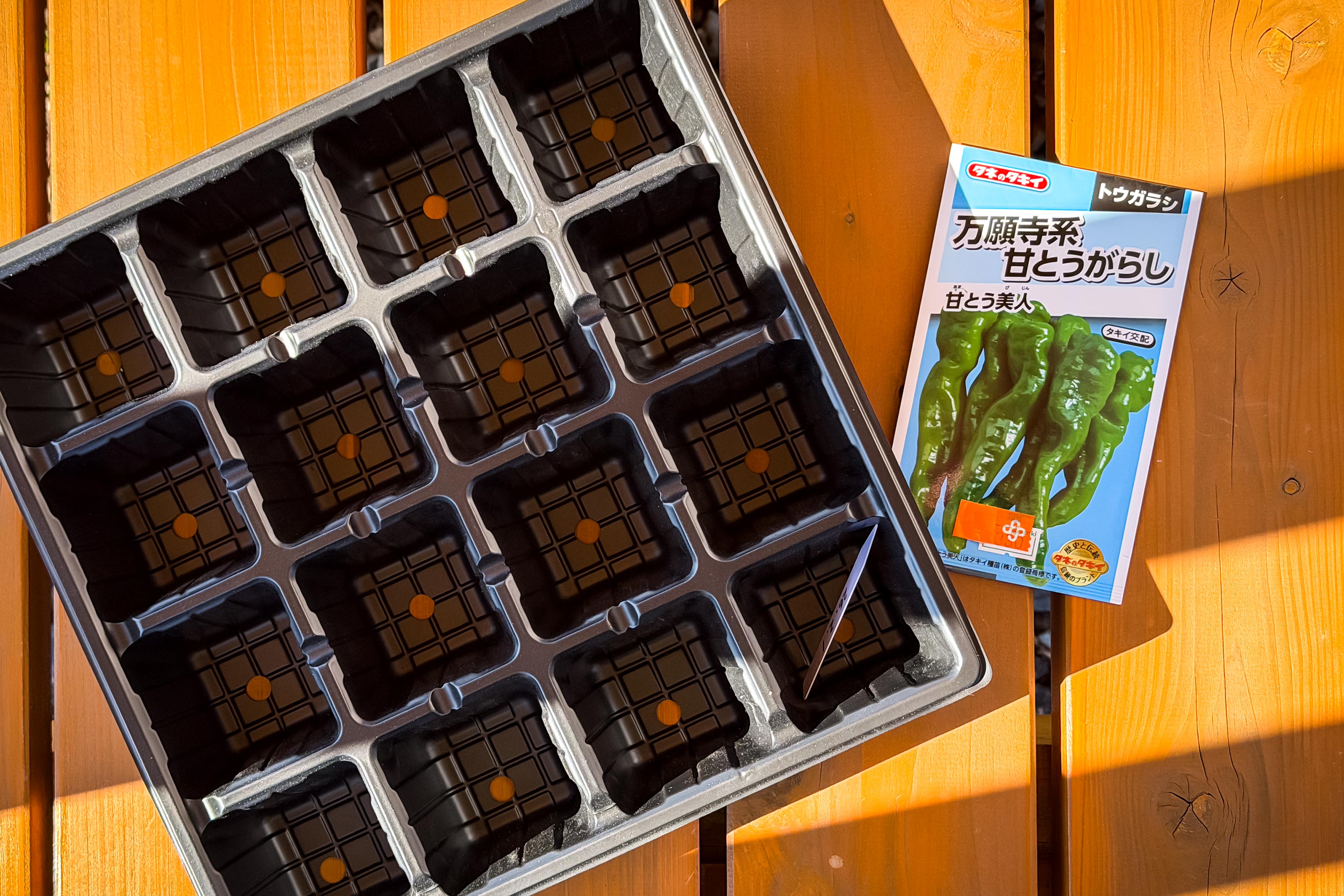 この週末、シシトウの種まきを実施しました。シシトウは春夏野菜としてナスと同じ4月下旬に畑に苗を定植する予定となっており、例年ですと種からの育苗ではなく、苗を購入してきて植えていましたが、昨年育てたシシトウの品種(伏見甘長とうがらし)は収量こそ多いものの肉質が少々硬く食感があまり良くなかった気がするので、今年は万願寺系甘とうがらしの ”甘とう美人” を育てる計画。こちらは過去に東京で育てた経験があり、柔らかな肉質の実績。