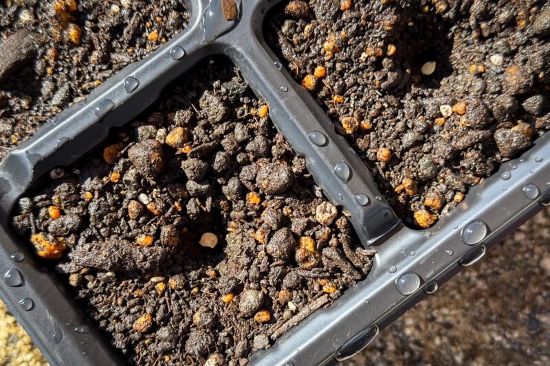 我が家には種まき用培土などありませんので、一般的な園芸用培土を使いましたが、大きな土の粒がゴロゴロしているような場合はさすがに芽を出しにくいだろうとそれらは出来る限り排除しておきました。また、種まき後に水をあげるとロクなことにならないと以前畑の先生に習いましたから、種蒔き前に土を十分に湿らせておき種まき後はそれらを被せるだけにしておきました。