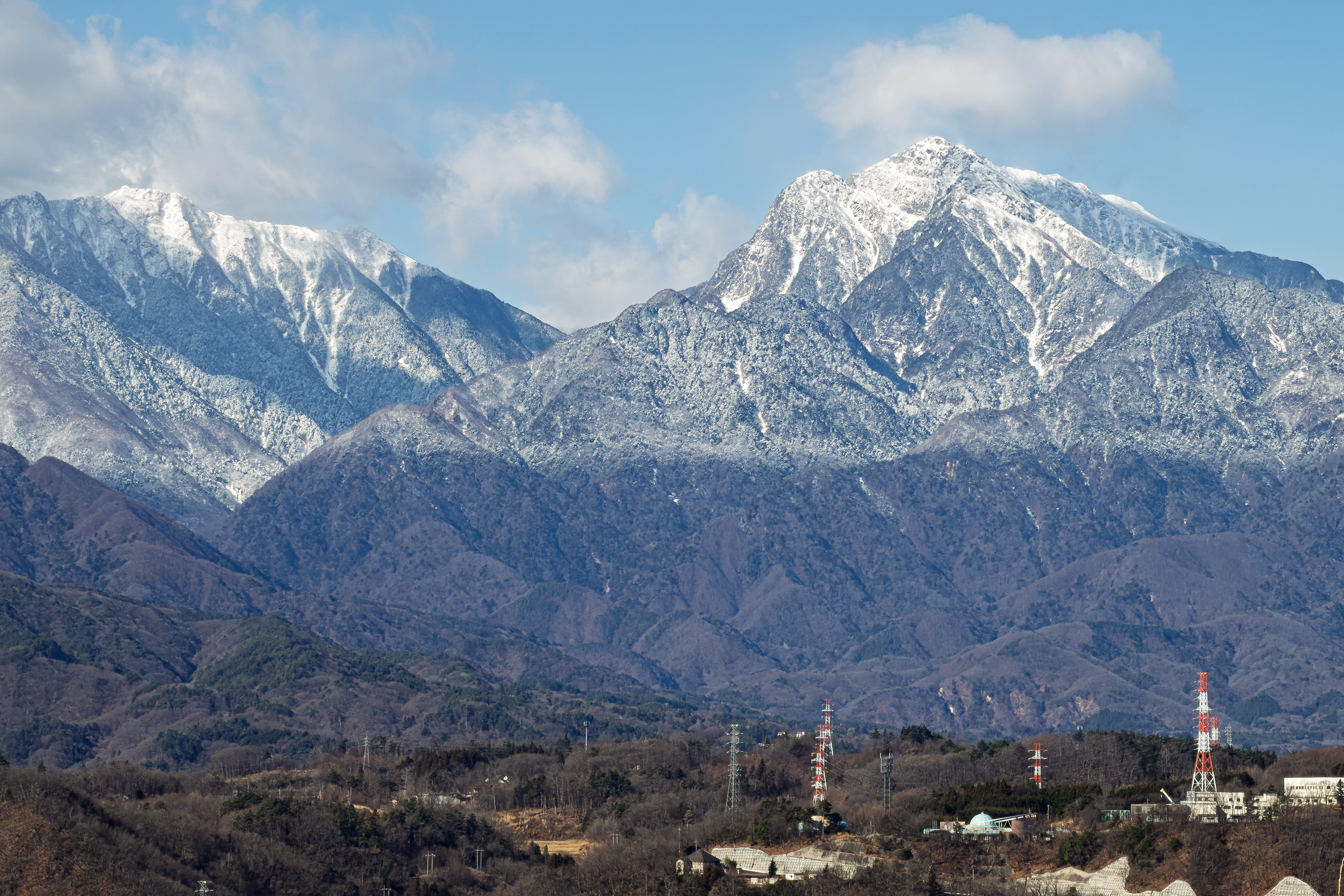 自宅から見た甲斐駒ヶ岳。日の出直後は寒そうな雲に覆われていましたが8時を過ぎた頃からご覧の通り。昨夜の雨が標高の高いところでは雪だったことが分かりやすく現れた絵。