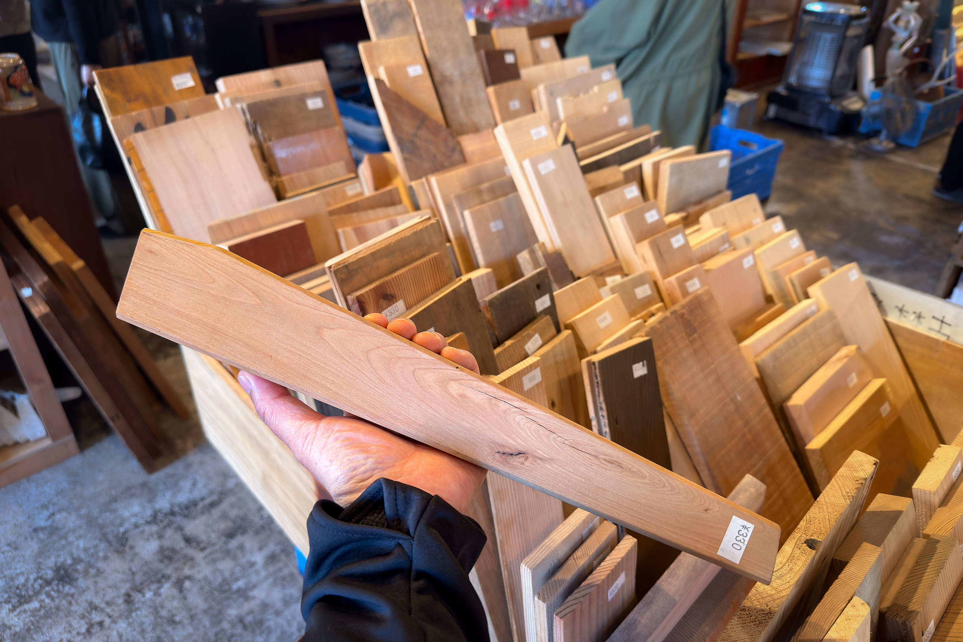手に取った瞬間に即購入を決断したのがこちらの木材。椅子やテーブルの足として使われていたものかと想像しますが、長手方向に太さの違うこの形状が我が家のとある使い道にぴったりでして、なんなら近々こうした形状のアイテムを探すか作るかしないとなぁと考えていたところでした。