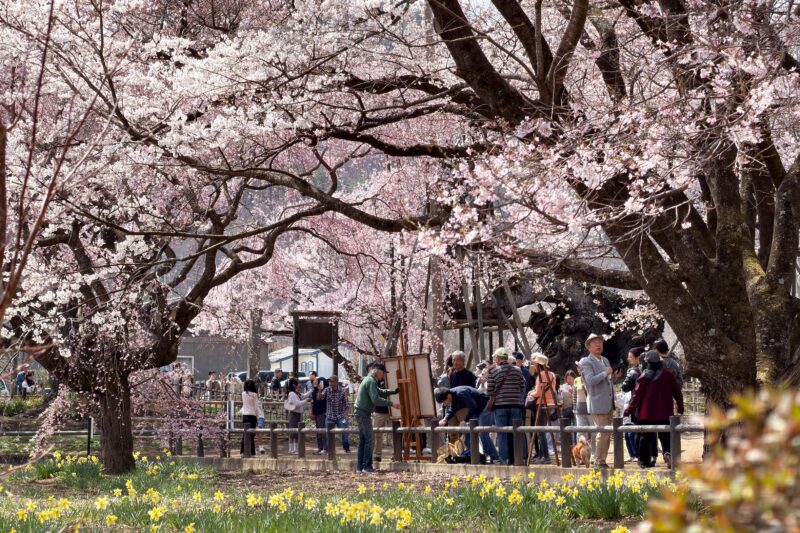 神代桜は足元に黄色い水仙の花、見上げれば大木の桜という構図が成立します。桜と組み合わせる黄色といえば菜の花が多かったりしますが、ここは比較的短命な水仙にも関わらず、昨年も桜と息を合わせたように開花していたのが不思議です。