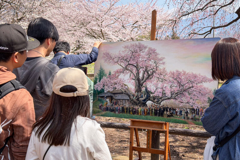 敷地内で何やら人だかりができていたので近づいてみたらご覧の通り見事な絵が展示されていました。こちらの桜そのものを絵にしたというよりは、古き良き時代のこの場所を想像して描いた絵という感じでして、描かれている人々は着物をきていたり真っ黒な洋装姿だったりして、なんだか大変重厚な絵ながら桜の存在によって和みが感じられる素晴らしさがありました。
