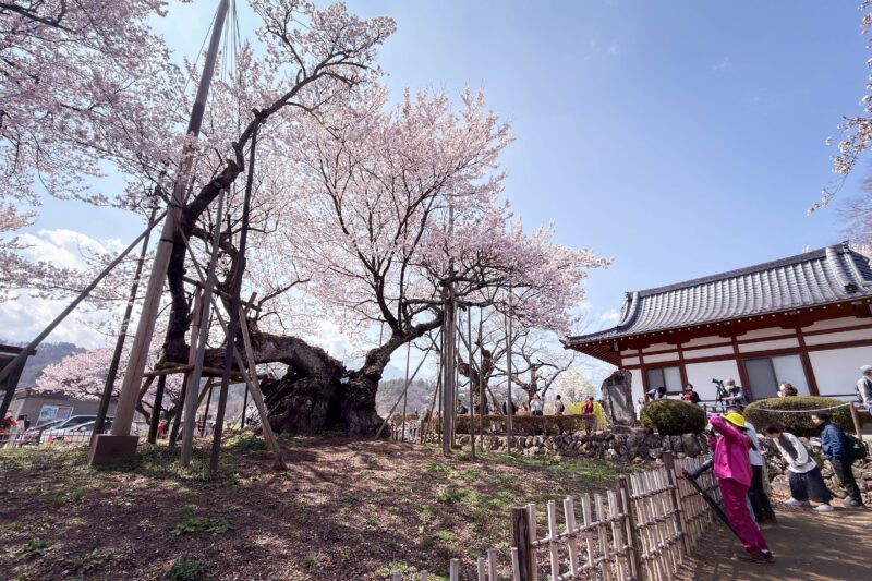 神代桜で一番有名なのがこちらの日本一古い桜。樹齢2,000年とも言われる野生のエドヒガンザクラ。あまりに大木すぎて自立できず、太い枝は折れないよう無数の支柱に支えられて生き延びている姿。