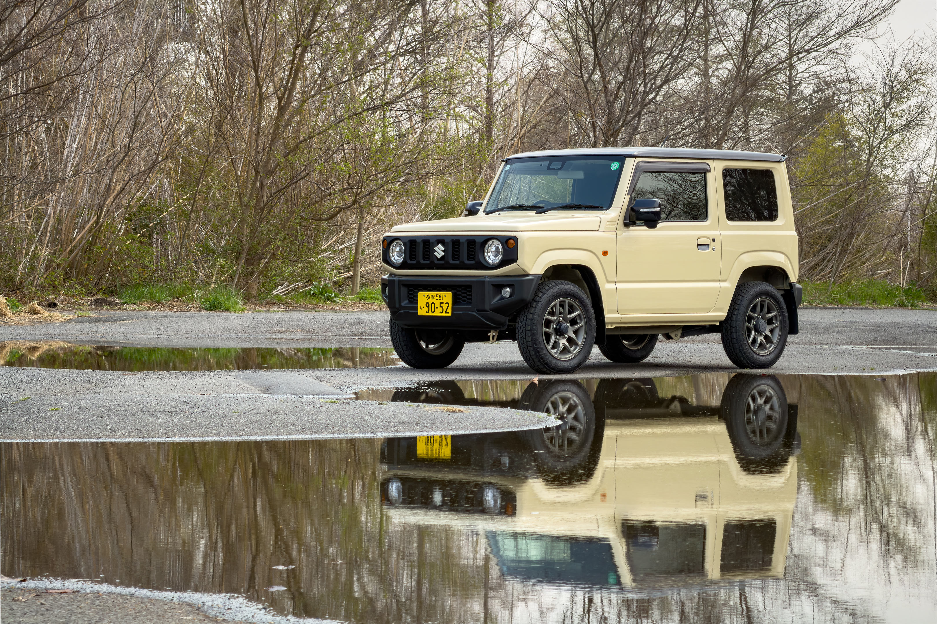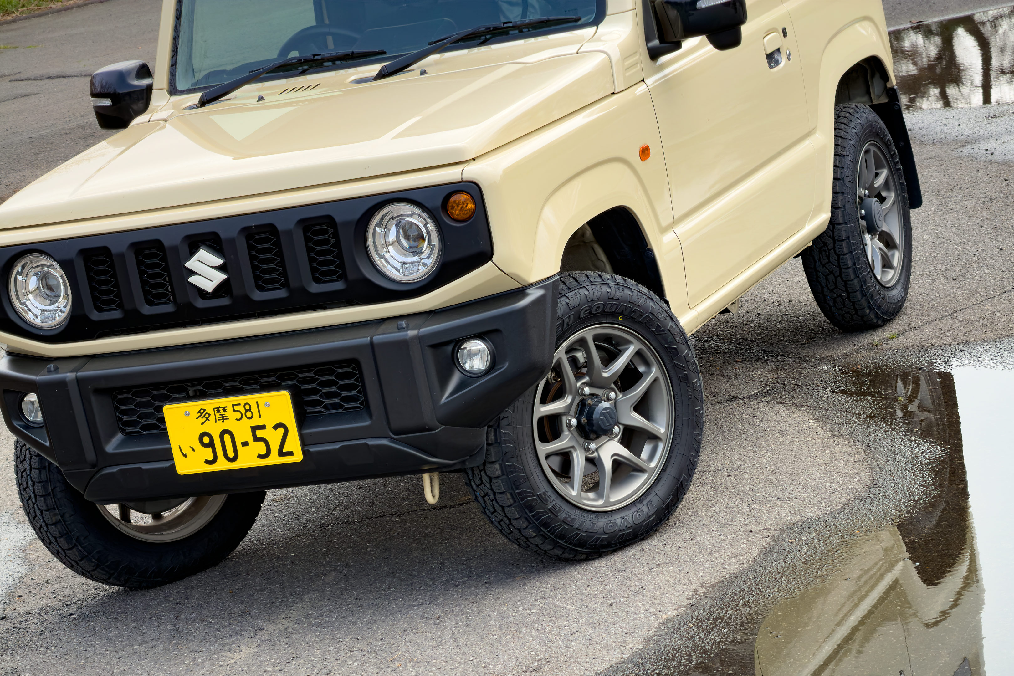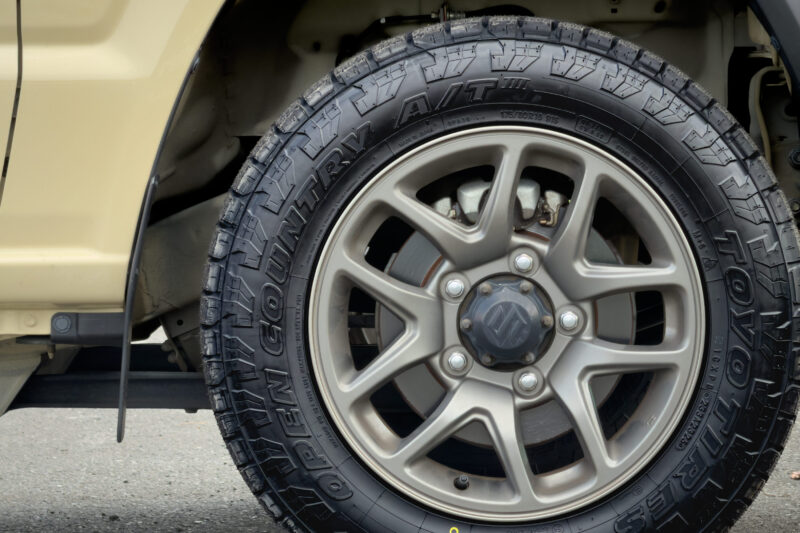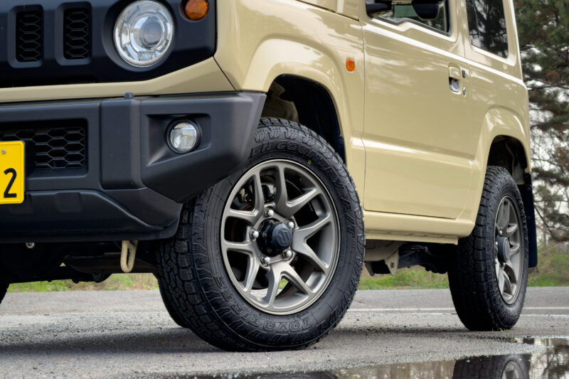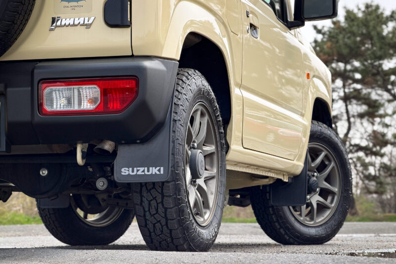 タイヤ交換後のジムニー。これまでTOYO TIRE OPEN COUNTRY AT Plusを約5万キロ使用してきて、ジムニー標準のHTタイヤと比較しても大差ない静粛性と溝の深さゆえ結構長持ちする点、何より出先での突然の天候変化や路面状況にも幅広く対応できるオールテレーンの心強さに「次もこれでいいかな」と考えていました。