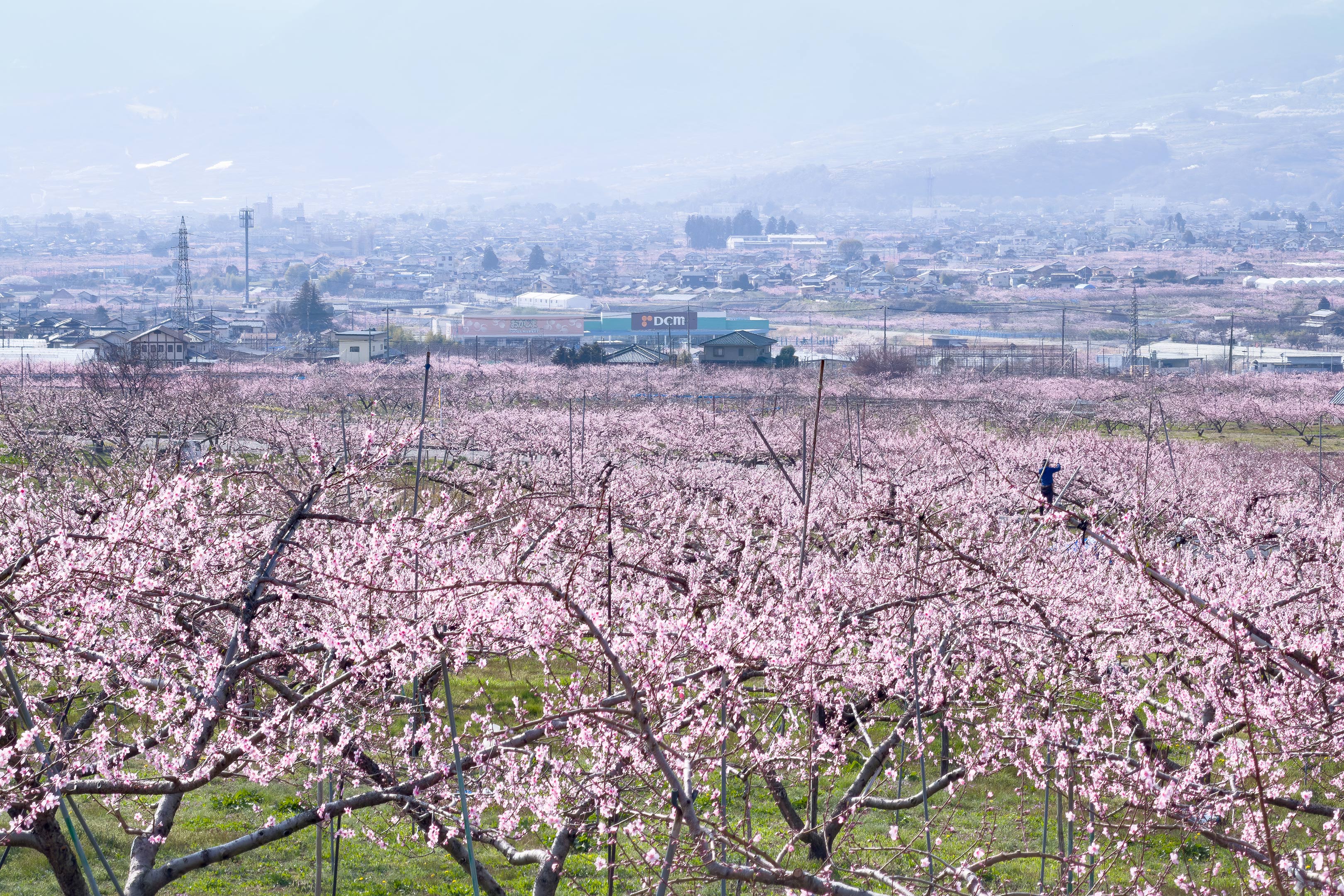 桃の木そのものは桜に比べれば遥かに小さい木ですが、桃の花はソメイヨシノよりも遥かに色濃く存在感があり、それが桃農園一面を覆い尽くし、遠くの遠くまで桃畑が続けば、小高い丘から眺めるその畑はさながら桃色の絨毯のよう。山梨は本当に桃畑が多いので車で車道を走っていても左右一面がピンク!なんてこともあります。