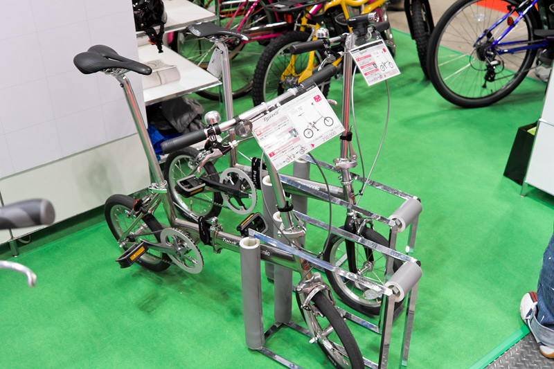 今回私が会場で注目していたのは20インチ程度のミニベロ系。トレンクルで長距離を走るのはしんどいけれど、かと言ってロードバイクはちょっと...という時に、丁度その中間を埋めてくれるのがミニベロ。形もカッコイイですし、走行性能も本気モードに対応出来ます。オレンジのフレームが一際目立っていたのはESRというメーカーのマグネシウムフレーム&フォークを採用した軽量自転車。写真のモデルはハンドルとタイヤが変更されていると聞きましたが、現在はコンポーネントもフル装備で販売しているところ、今後はフレームのみの販売も検討中との事。内装ギアを使うか外装ギアにするか、ペダルやディレーターはどうするか...と考え始めると、結局最後は自分好みのものに付け替える事になりますから、フレーム販売はありがたいですね。マグネシウムと聞くと驚くような価格かと思いきや、7〜8万円だそうです。この価格ならアルミのほうが高いくらいですね。
